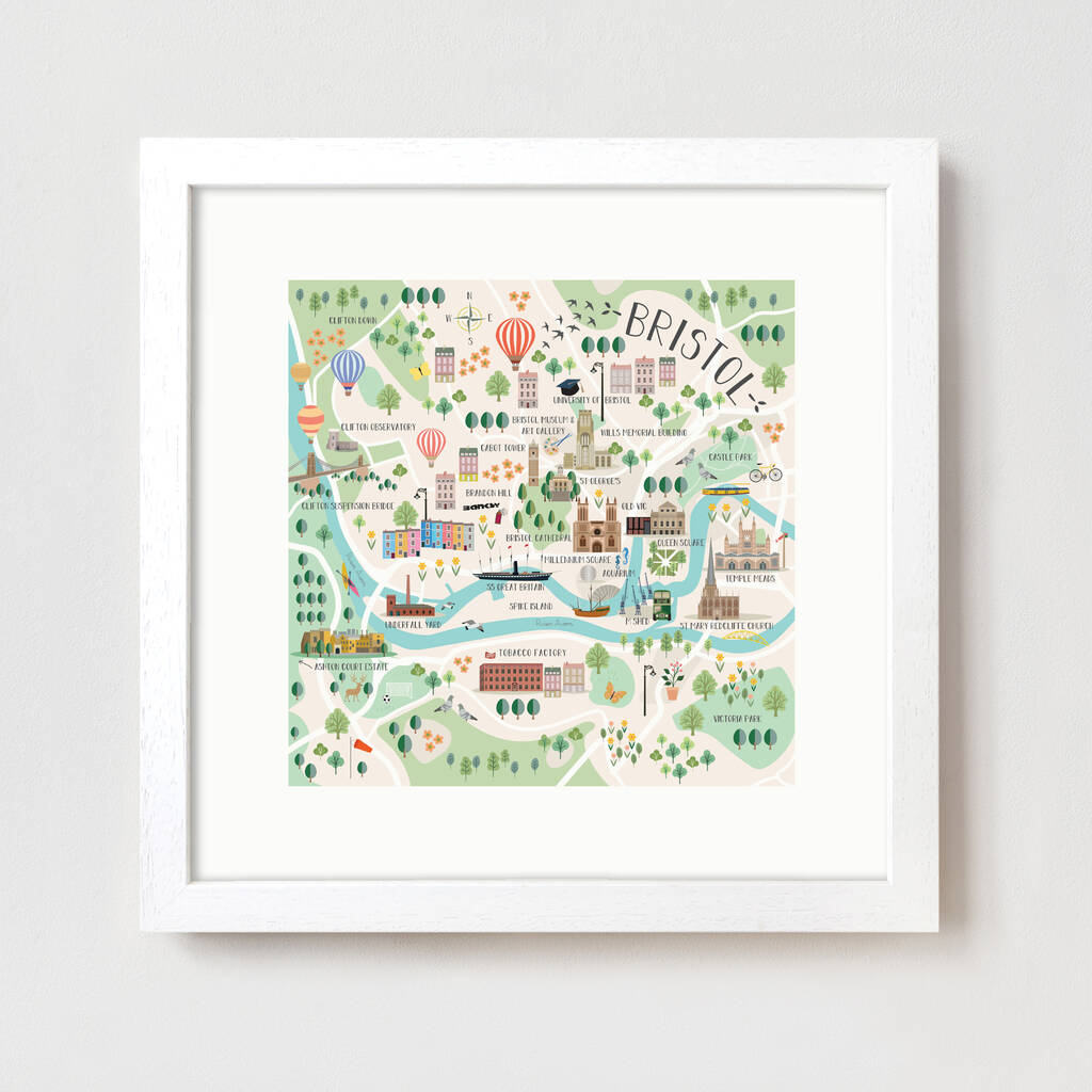 The artwork depicts a richly illustrated map of the city of Bristol, featuring prominent sights, buildings and landmarks labeled with their names.