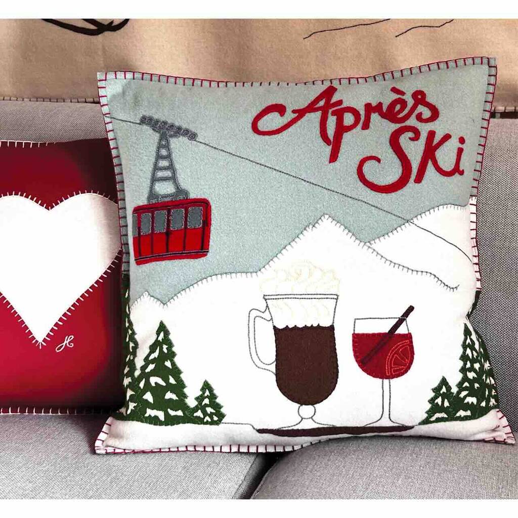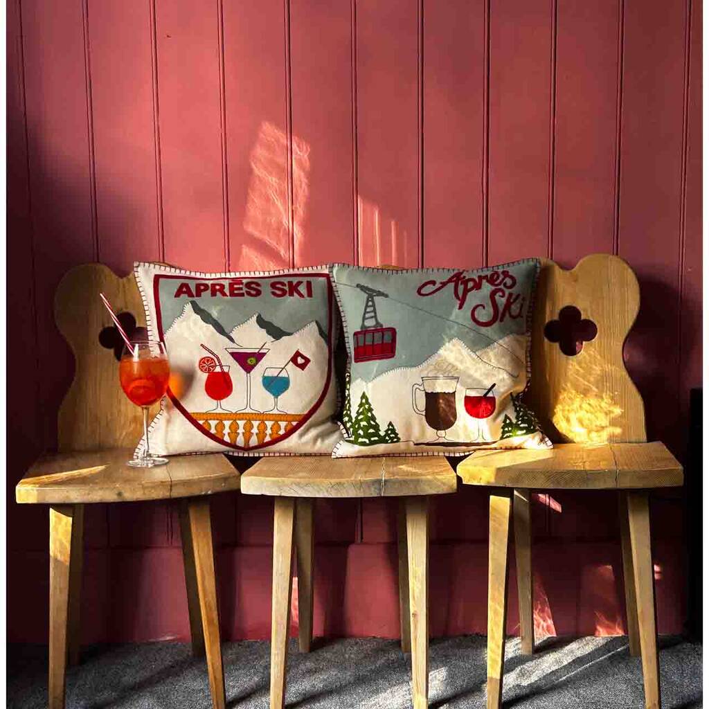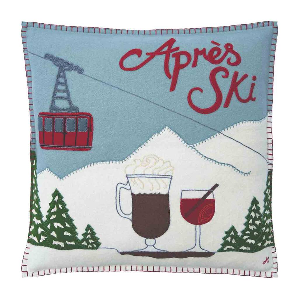 Crafted from pure wool in a soft cream and duck egg blue palette, it features hand-embroidered appliqué script reading "après ski" alongside festive motifs—snow-dusted Christmas trees, a charming cable car, and snowy peaks. Perfect for evoking cosy winter nights, hot toddies by the fire, and the spirit of the Alps, this cushion is the ultimate in seasonal sophistication and comfort.
