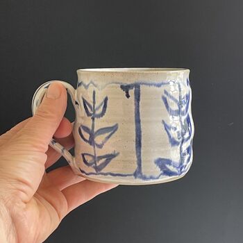 Big Huggable Mug With Blue And White Abstract Floral Hand Painted Design