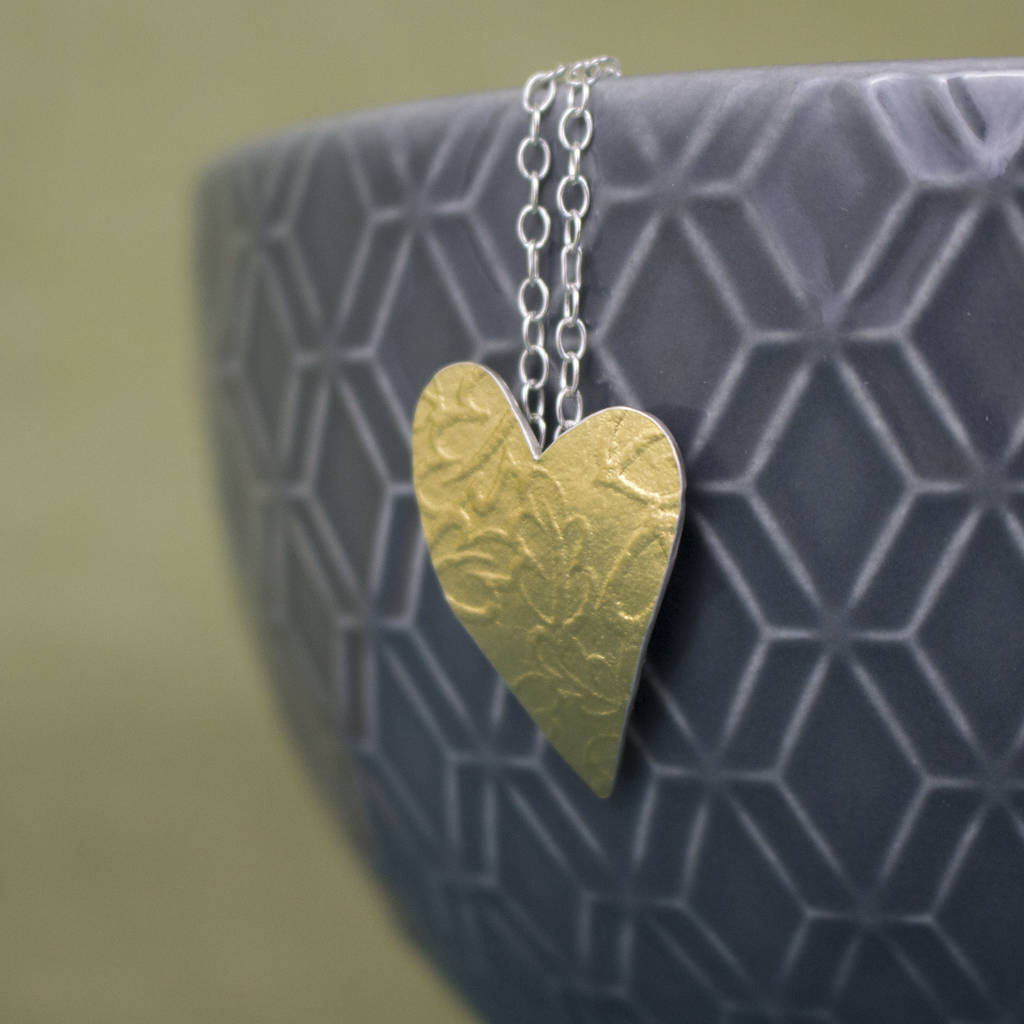 A sweet and simple heart shaped silver and 24k gold pendant embossed with a beautifully tactile texture of oak leaves.