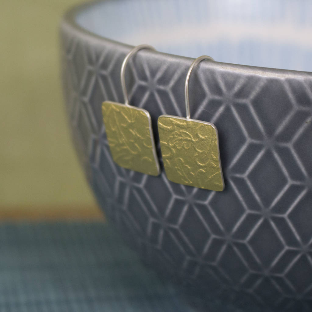 A sweet and simple tag shaped pair of silver and 24k gold earrings embossed with a beautifully tactile texture of oak leaves.