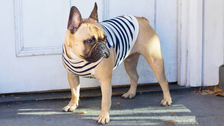The dog in our photos is our beloved pet French Bulldog, Cooper. He wears a collar size M, jumper size L-broad and coat size L.