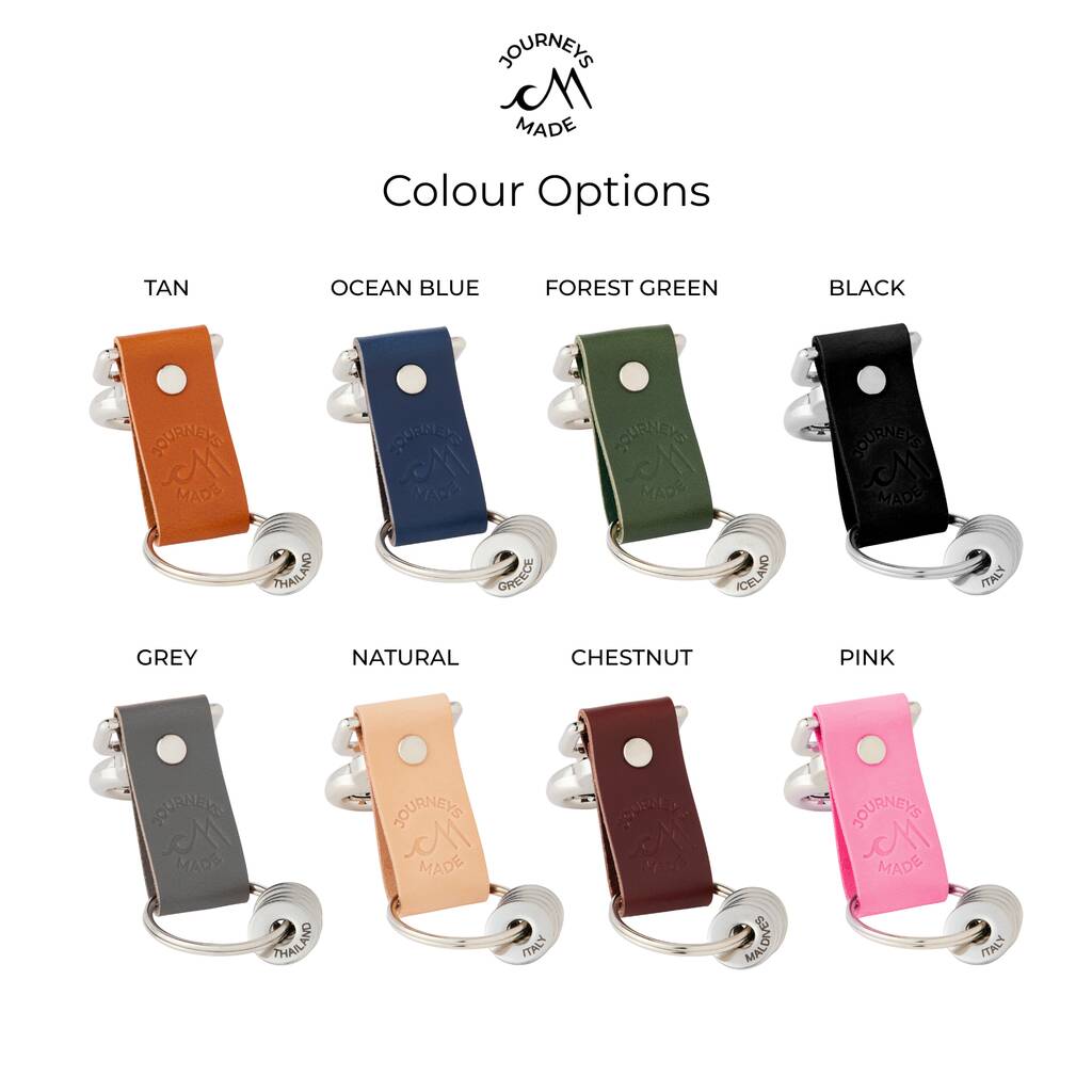 Available in eight colours: Tan, Ocean Blue, Forest Green, Black, Grey, Natural, Chestnut and Pink. Simply choose your leather colour and select how many engraved tokens you’d like to include.