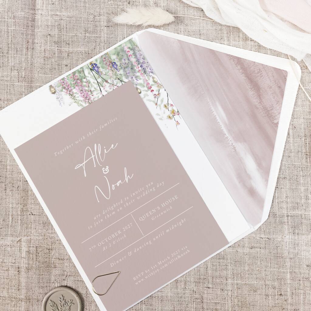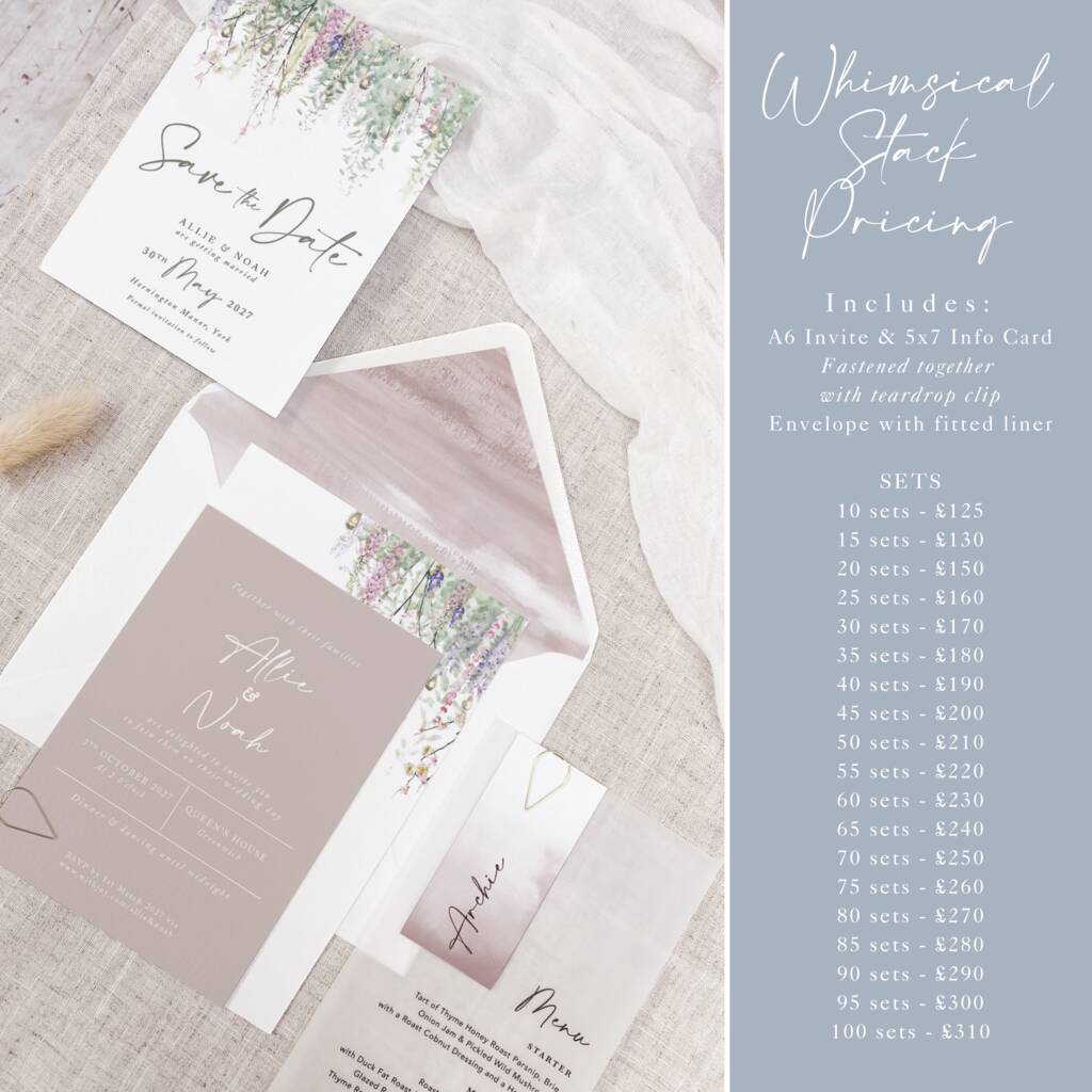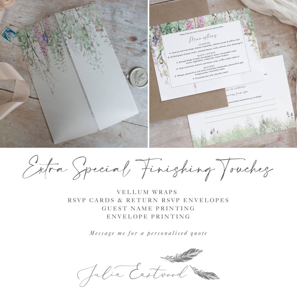 A full coordinating stationery suite is available, including save the dates, menus, place cards, and orders of service — all designed to complement the Whimsical Spring theme.Bring a romantic, garden-inspired feel to your wedding with these UK-printed personalised invitations — perfect for spring celebrations and pastel colour palettes.
