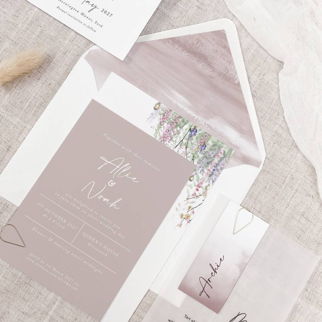 Each stack includes:- A6 Wedding Invitation- 5x7 Information Card (single or double-sided)- Luxury Tear Drop Clip to hold your suite together- Envelope (choice of colour) with fitted & glued floral linerProfessionally printed in the UK on textured Tintoretto Gesso cardstock, these invitations feel as luxurious as they look. Optional finishing touches available (vellum wraps, RSVP cards & envelopes, guest name printing, envelope printing). Message me for a personalised quote.