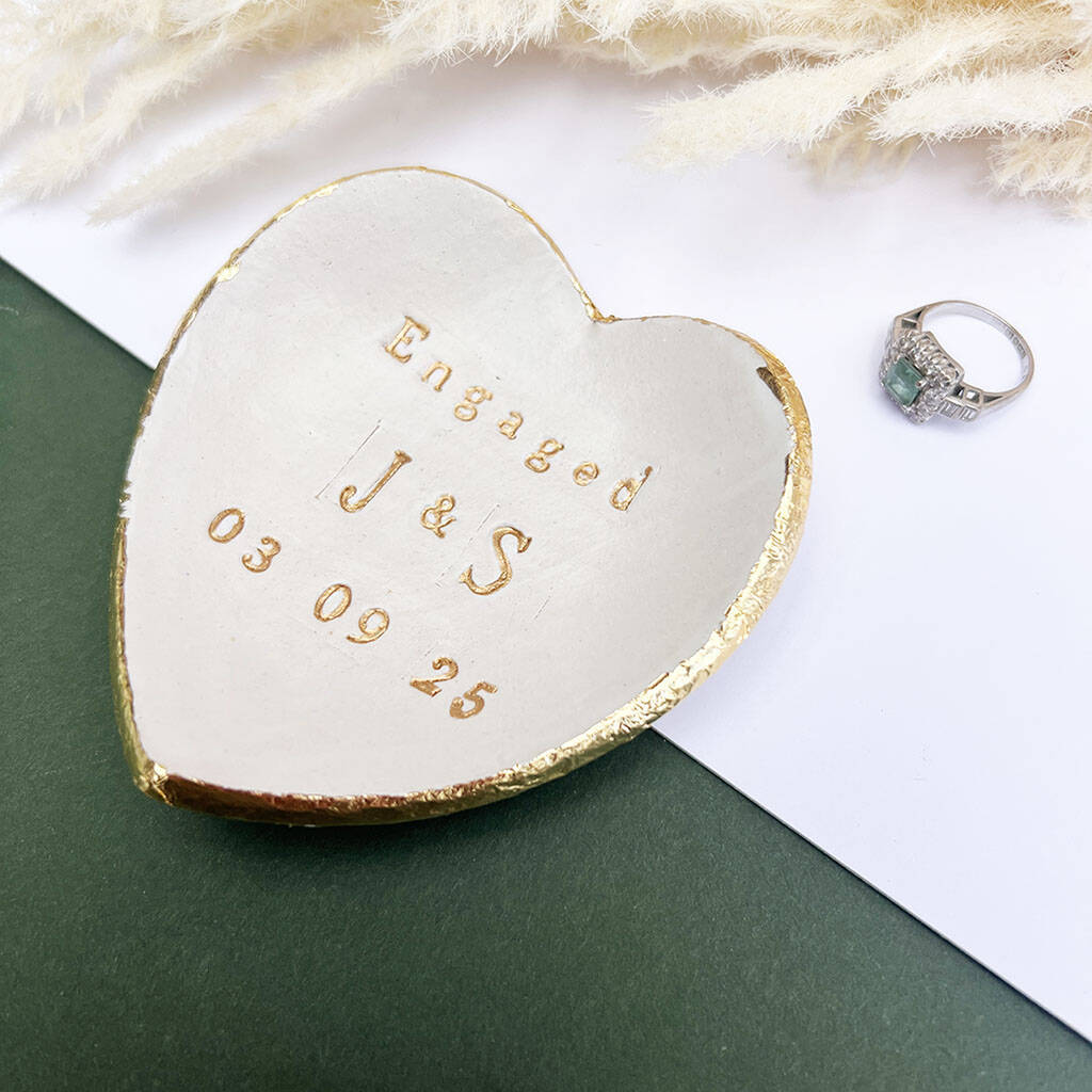 A lovely heart shaped ceramic ring dish, with the engaged couple's initials and engagement date.