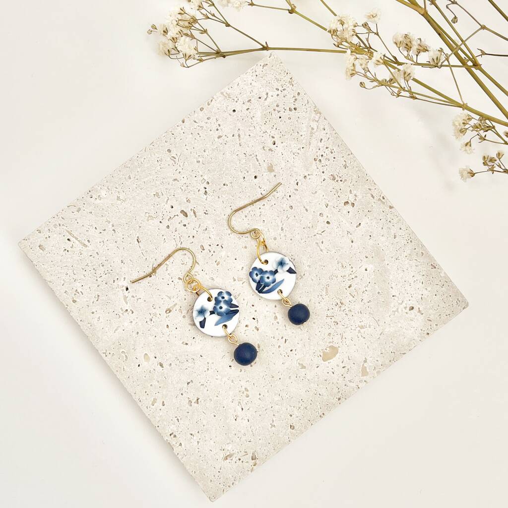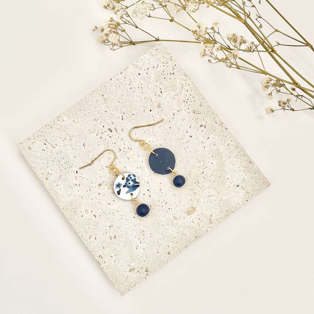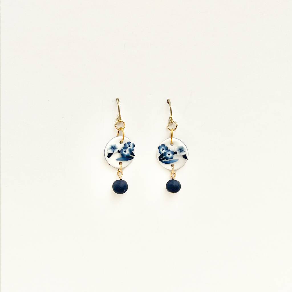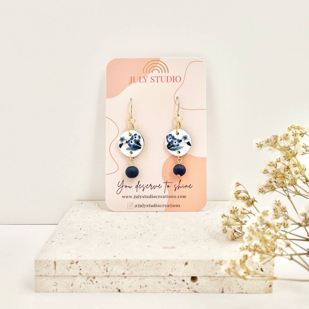 Handmade Blue And White Floral Dangle Clay Earrings