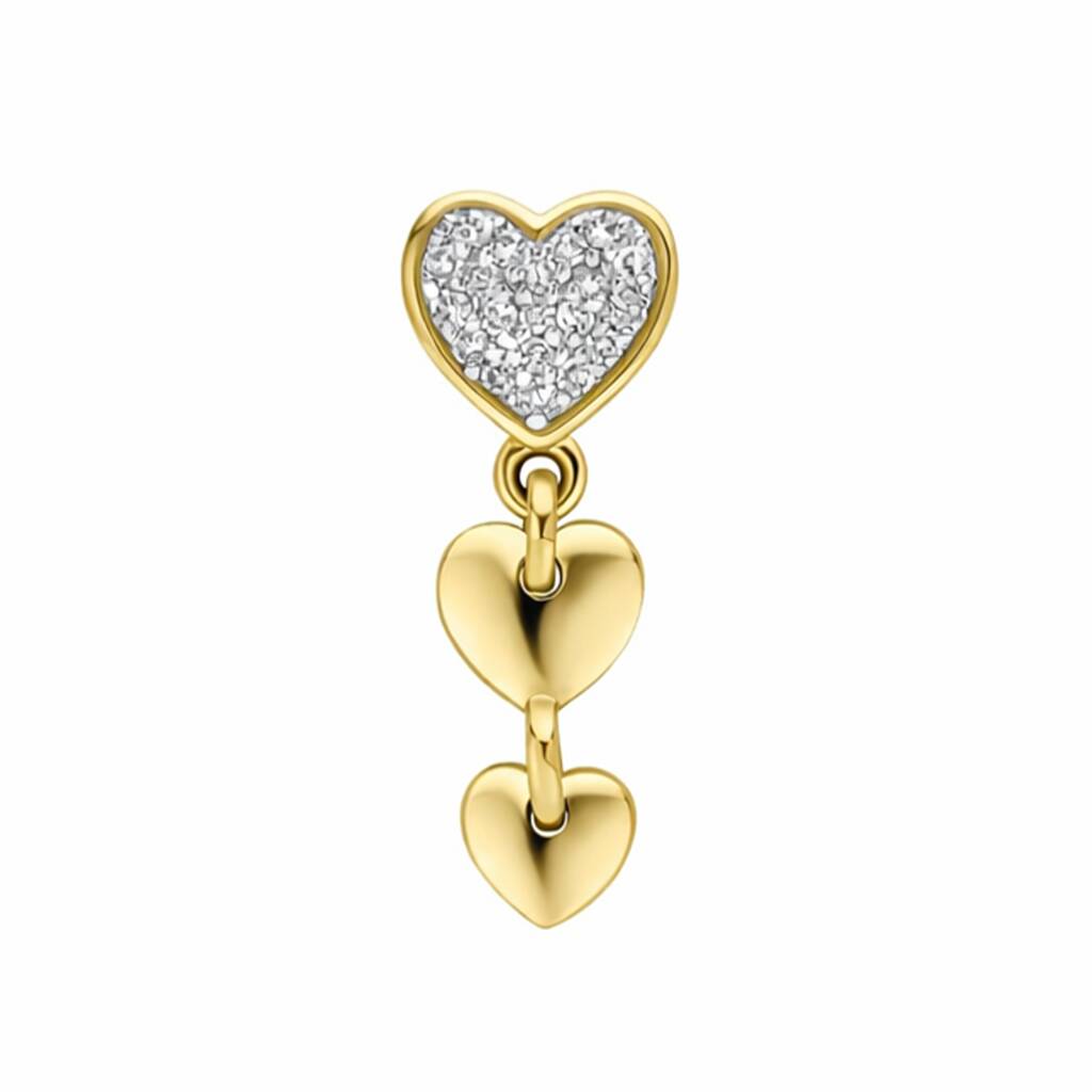 The design presents a graceful cascade of three softly curved hearts, a sophisticated and symbolic trinity that speaks a silent language of love, friendship and cherished memories. The uppermost heart, set with a captivating array of glittering diamonds, serves as the radiant focal point, catching the light with every subtle movement to emit a delicate yet undeniable sparkle. Underneath this brilliant centrepiece are two flawlessly polished gold hearts, their smooth, mirror-like surfaces providing a stunning contrast that amplifies the fire of the diamonds and completes a beautifully balanced composition.