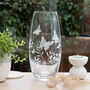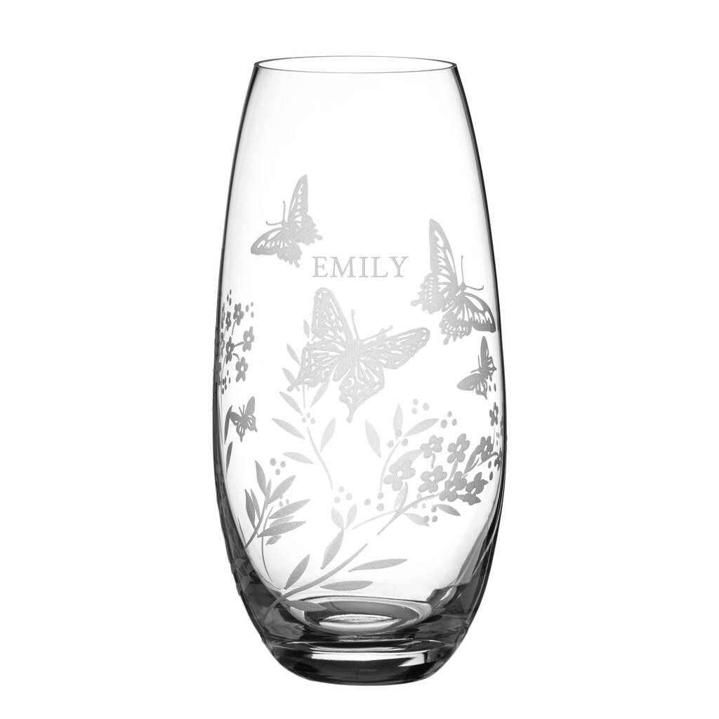 A stunning personalised butterfly floral crystal glass barrel vase - the perfect housewarming, Mother's Day, birthday or Christmas homeware gift for a loved one.