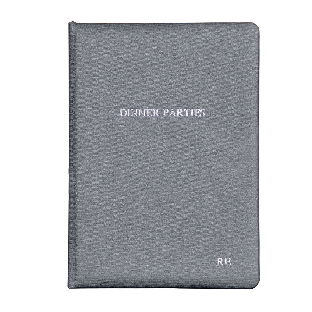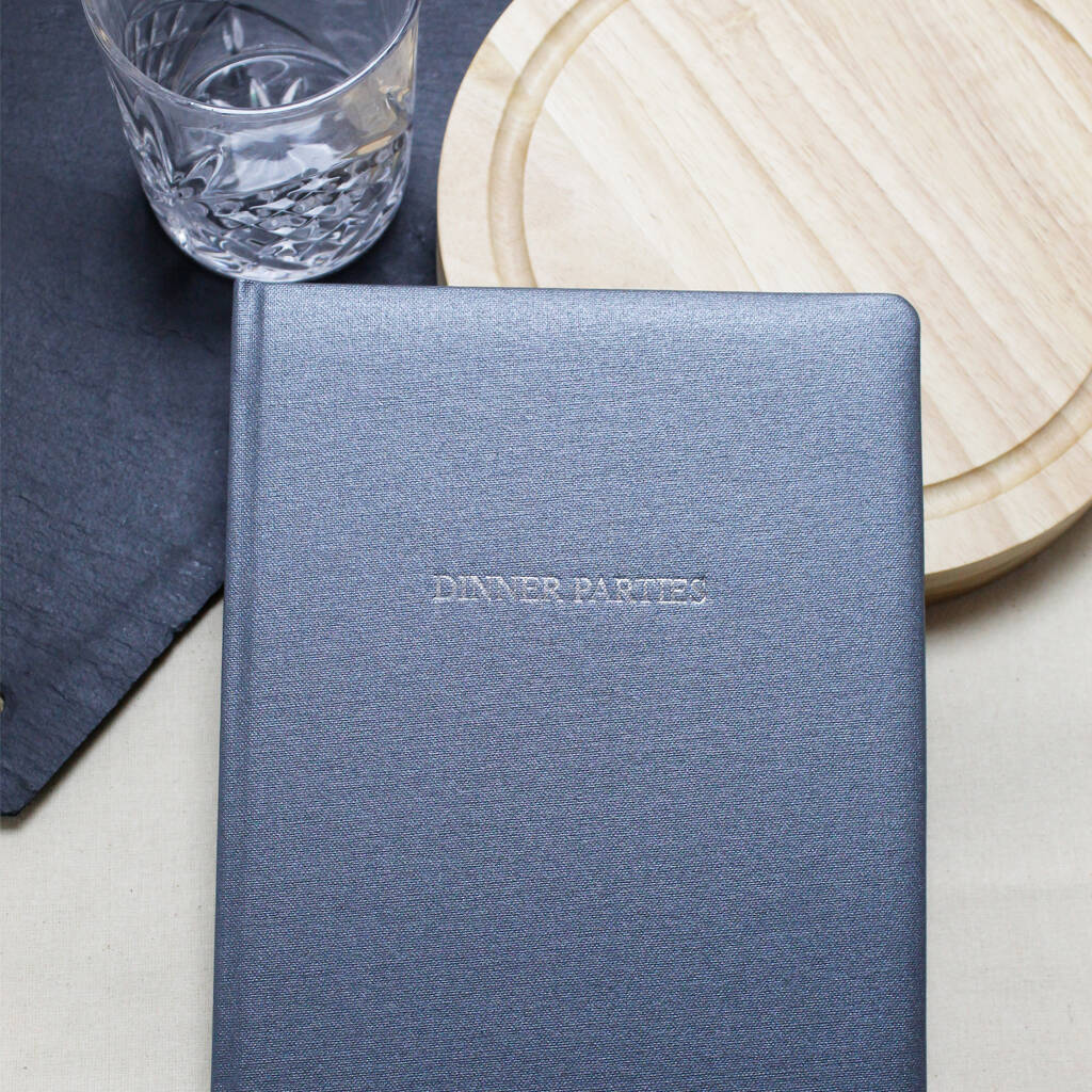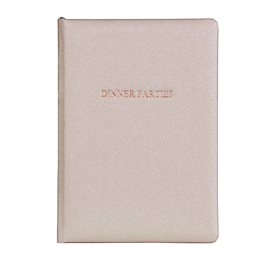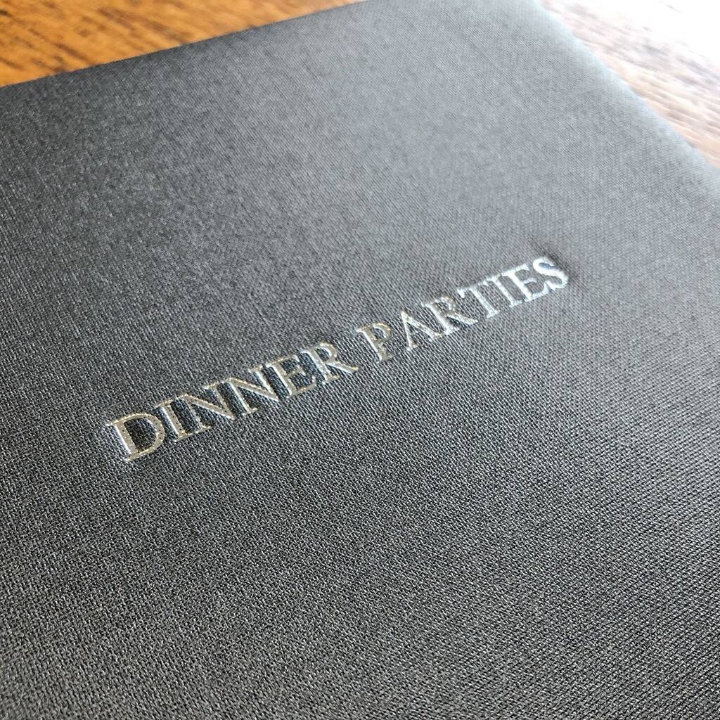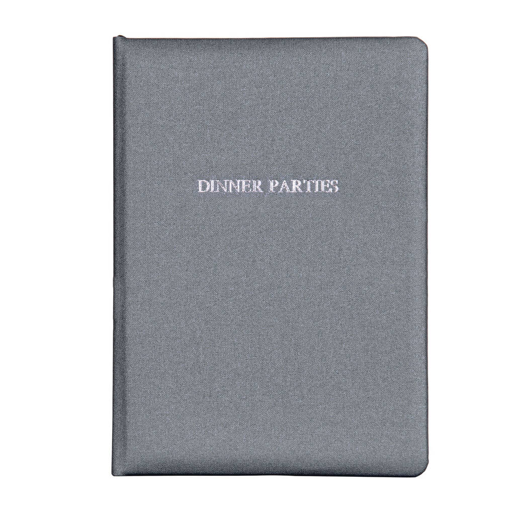 Designed and handbound in Britain, this elegant volume is crafted with a soft-feel padded front cover wrapped in luxurious metallic buckram. ‘Dinner Parties’ is prominently foil-stamped in the centre.