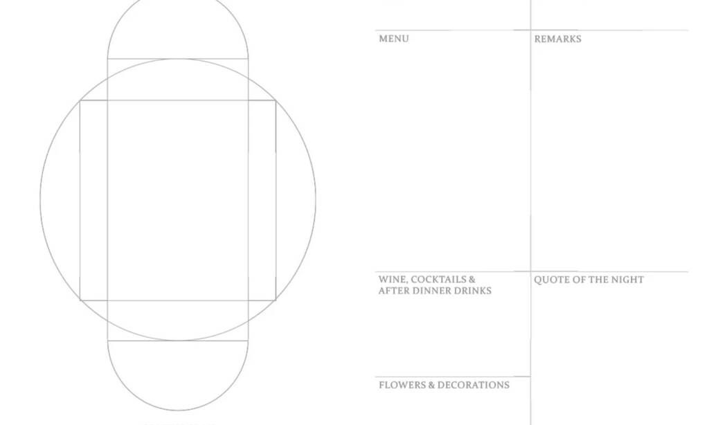Inside, the book has been thoughtfully arranged to capture every detail of your gatherings. On the left-hand side of each spread, you will find a dedicated Seating Plan section, represented by a clean, structured diagram of table arrangements, perfect for recording exactly where each guest was placed around the table. This allows you to look back and recall the company, conversation and atmosphere of your evening with accuracy and fondness.