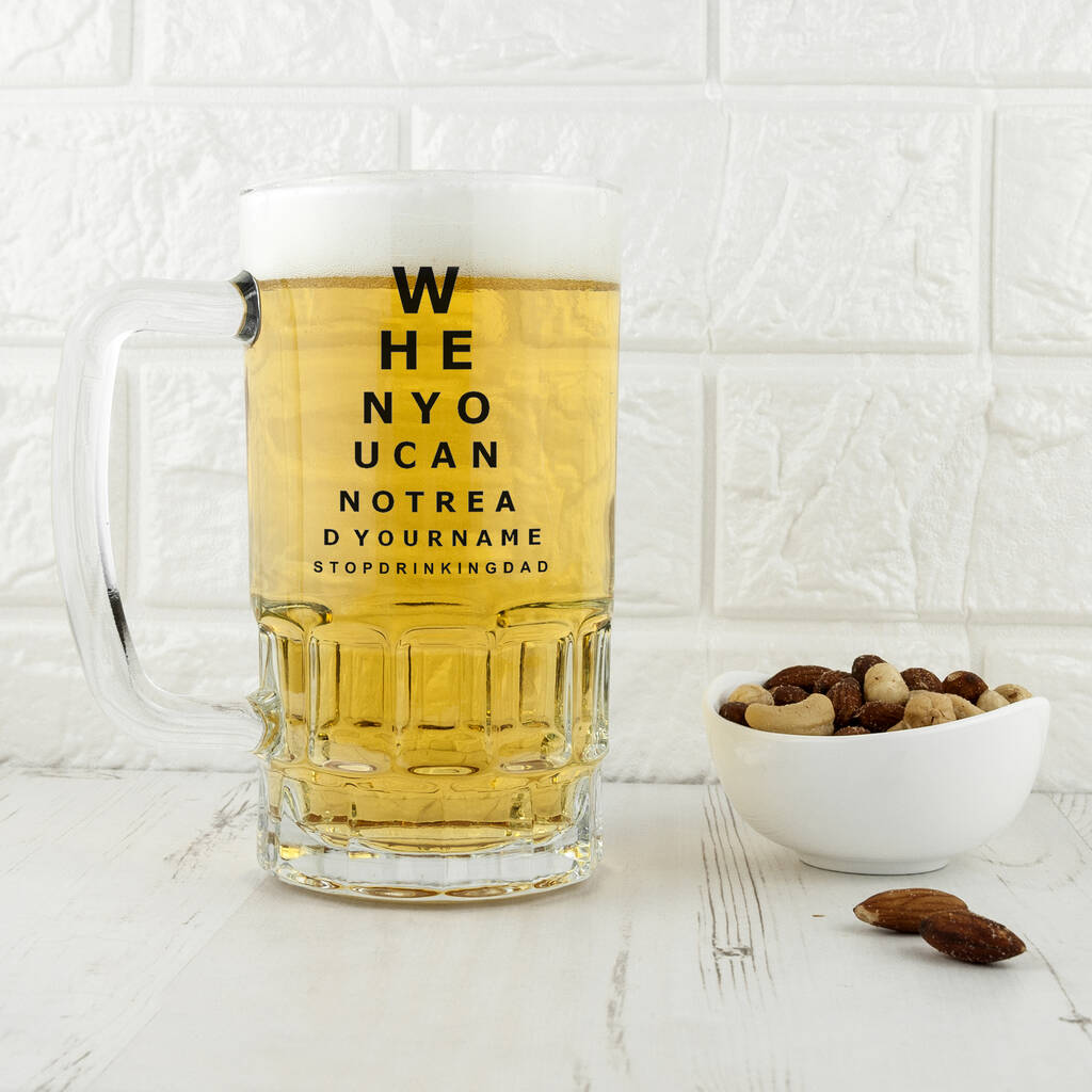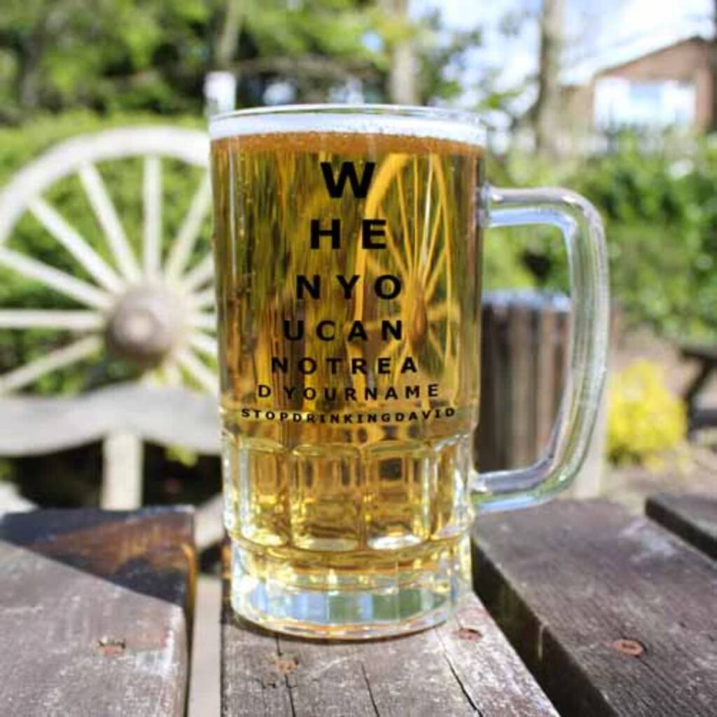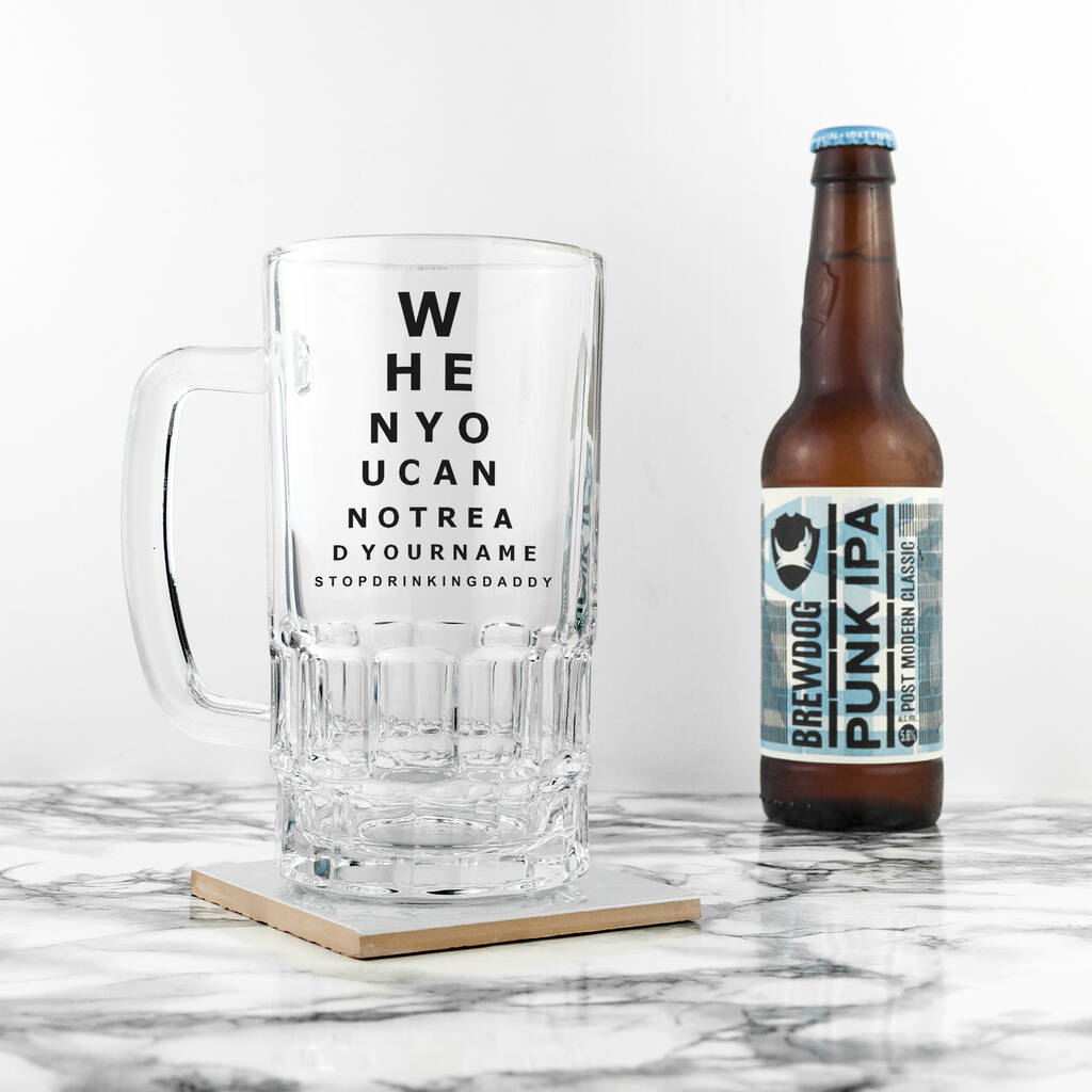 A fun and quirky Personalised Opticians Chart Beer Glass Tankard - the perfect Valentine's, Father's Day, birthday or Christmas gift for him.
