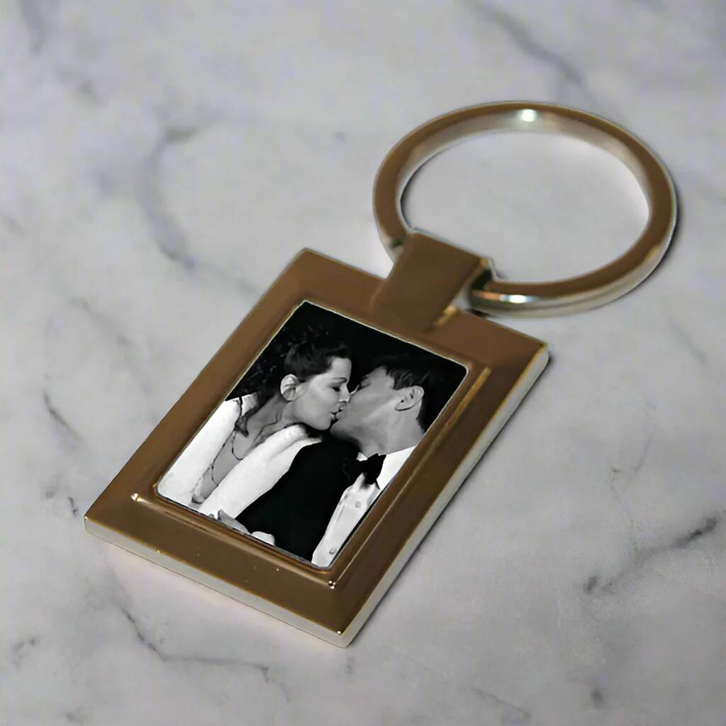 A beautiful and sentimental personalised rectangle photo keyring - the perfect keepsake accessory gift for Mother's Day, Father's Day, Valentine's, birthdays or Christmas.