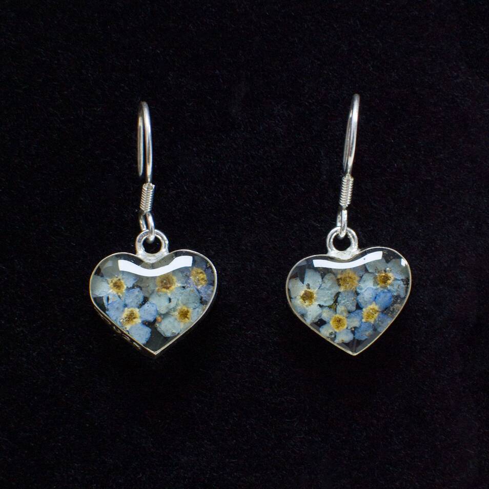 An exquisite pair of Real Forget Me Not Flower Heart Drop Earrings set in sterling silver; the perfect Valentine's or Mother's Day gift for her.