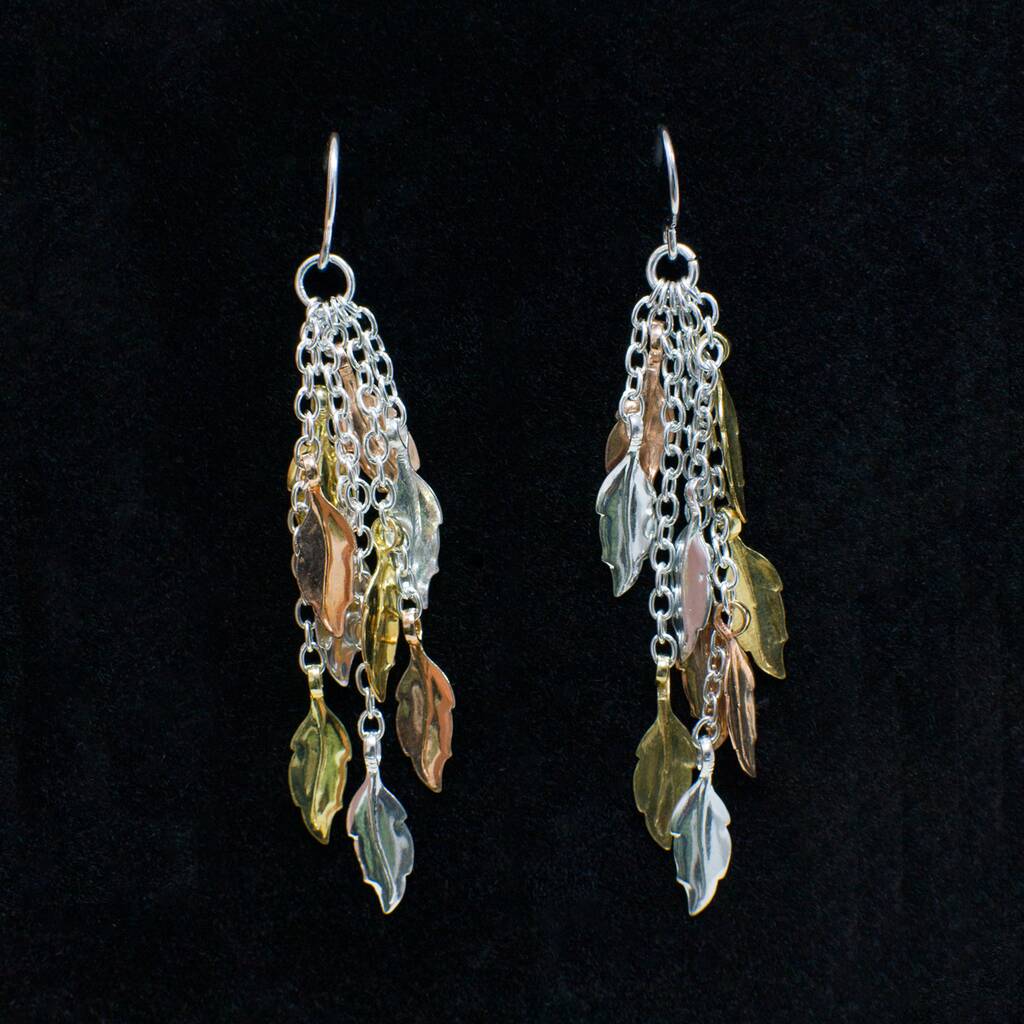 These exquisite drop earrings are meticulously crafted from premium sterling silver and feature a captivating waterfall of delicate leaf charms. Each earring showcases a harmonious blend of finishes, including radiant gold plated, sleek silver, and warm rose gold plated leaves, creating a rich tricolour effect that catches the light beautifully.