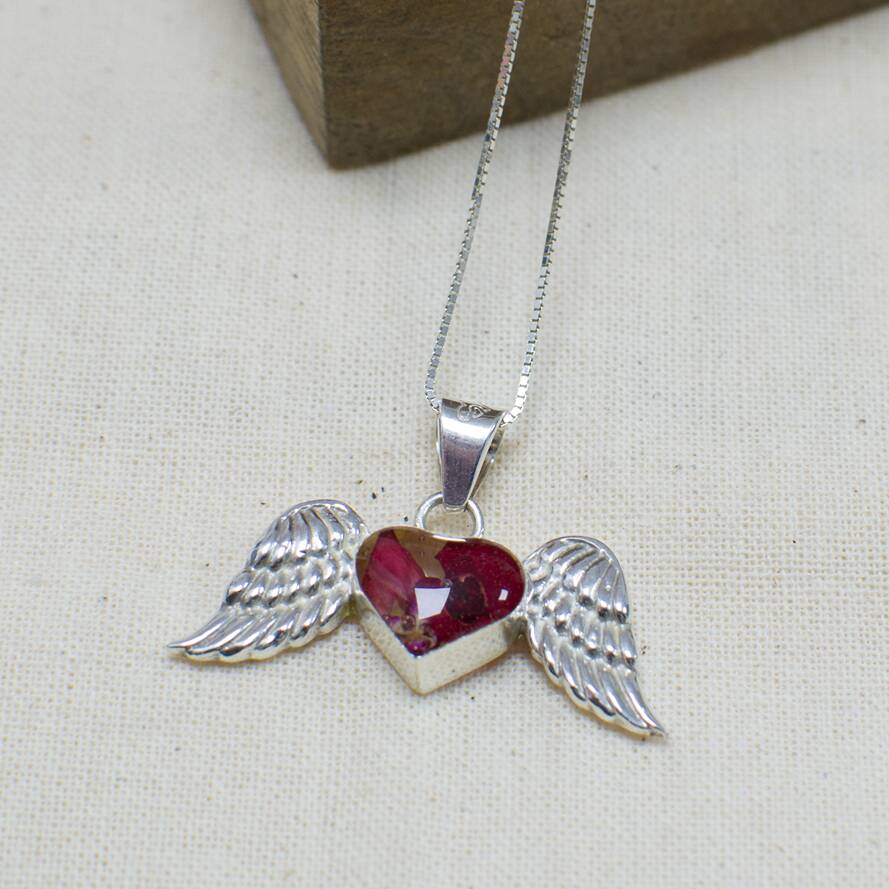 The heart is delicately framed by a pair of finely-detailed angel wings crafted from solid sterling silver, their gently curved, feathered texture lending a sense of movement, protection and grace. The pendant is suspended from a slim sterling silver chain, allowing it to rest beautifully at the neckline, where the contrast between the cool lustre of the silver and the rich, natural colour of the real flower draws the eye without overwhelming. The overall design is both timeless and sentimental, making it suitable for everyday wear as well as special occasions.
