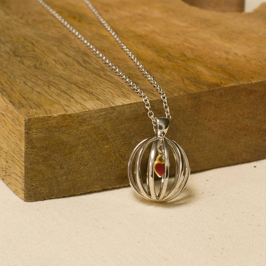 The centrepiece of this ensemble is a stunningly intricate pendant, fashioned in the likeness of a spherical birdcage. Each silver pillar of the cage is polished to a mirror-like finish, curving gracefully to form a symmetrical globe. Suspended securely within this airy, architectural frame lies a diminutive heart charm, rendered in a warm, contrasting golden hue. This heart within a cage motif symbolises a love that is safely guarded yet beautifully visible, creating a dynamic visual depth that draws the eye.