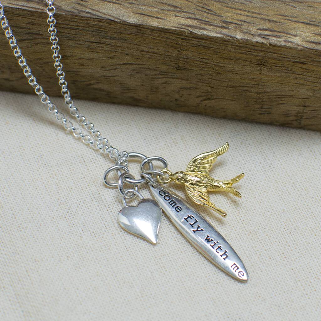 The first charm, a sleek sterling silver heart, embodies love and affection. Its smooth, mirror-polished surface reflects light elegantly, symbolising purity and devotion. Nestled alongside it is a slender silver tag pendant, gracefully engraved with the heartfelt phrase ‘come fly with me’. This poetic inscription evokes a sense of shared journey and invitation; a promise of companionship and adventure, whether in life, love or spirit. Completing the trio is a beautifully detailed golden bird charm, poised as though in mid-flight. The swallow bird, rendered in warm gold tones, symbolises freedom, aspiration and the courage to explore new horizons. Together, these elements create a delicate and meaningful design that celebrates both love and liberation.