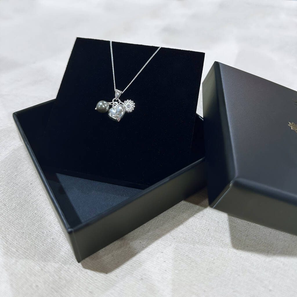 The second charm is a classic heart shape, polished to a radiant shine. Universally recognised as a symbol of love, affection, and emotional connection, the heart charm embodies warmth and devotion. It’s a timeless representation of romantic love, familial bonds, or cherished friendships, making it a versatile and deeply personal element within the composition of the necklace.