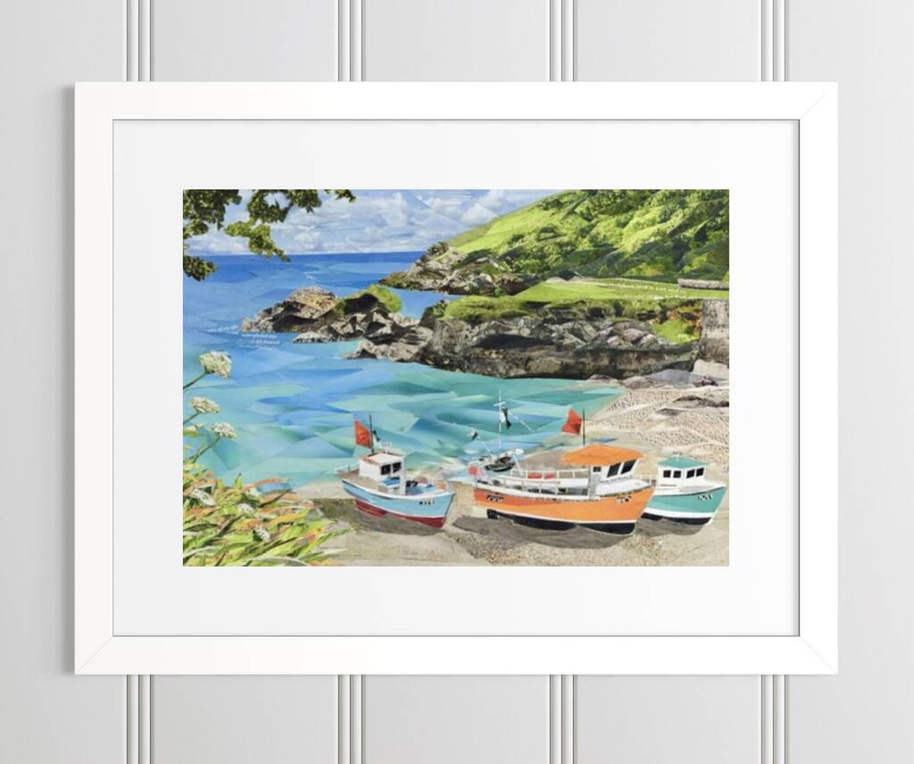 Inspired by the colourful fishing boats and turquoise waters of Cadgwith Cove in Cornwall, this artwork is taken from my original hand-cut collage, created using layers of reclaimed and recycled paper.