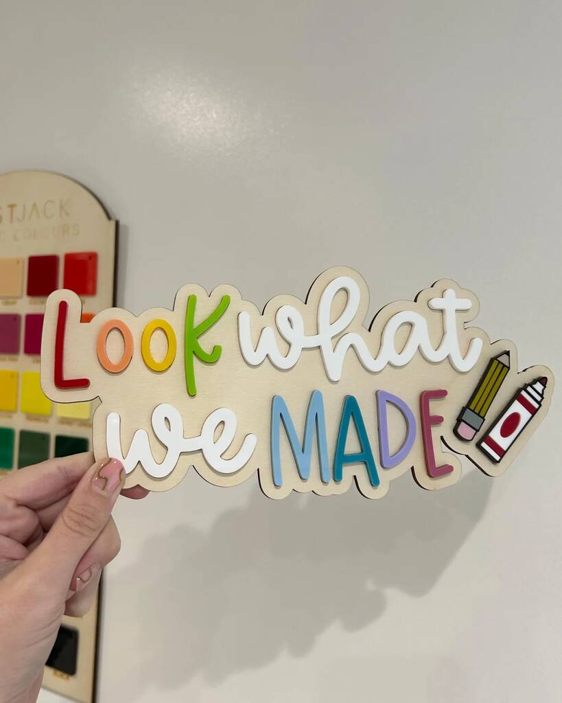 Wooden Playroom Sign – Children’s Art Activity Decor, 'Look What We Made' Montessori Accessory