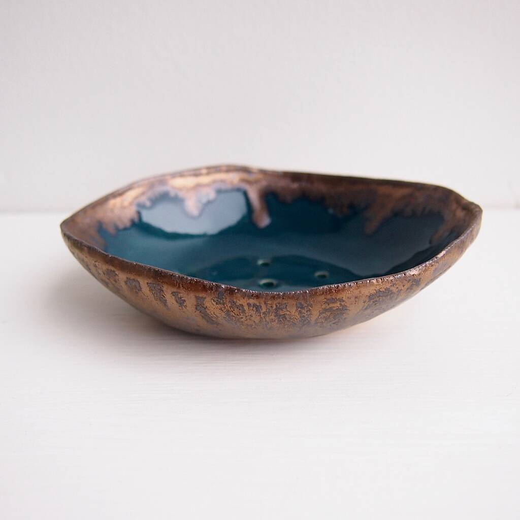 Handmade Teal And Gold Oval Pottery Soap Dish