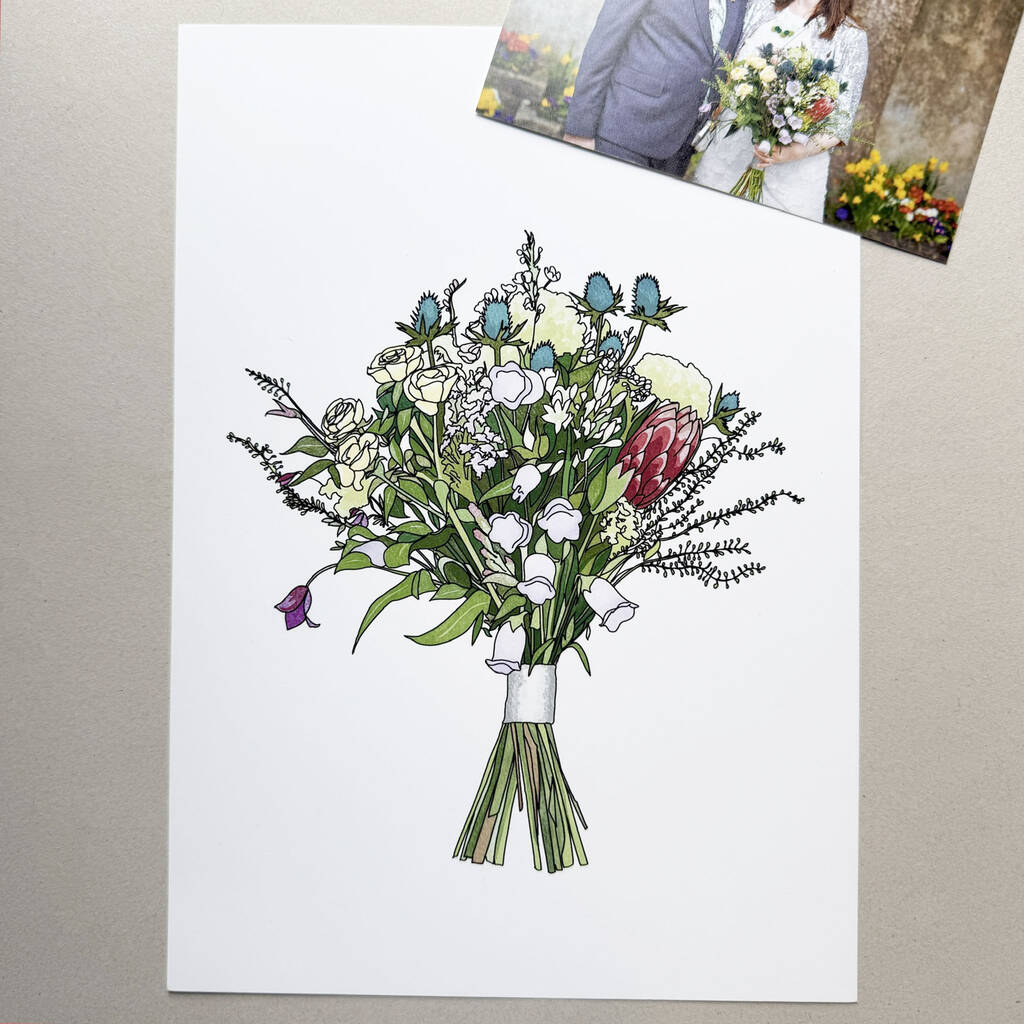 A great way of preserving those all important blooms, from a good photo of the flowers and I will recreate it as a unique keepsake.A great way of preserving those all important blooms: a hand drawn illustration of your wedding bouquet. This makes a great anniversary gift, or memento of the day. All I require is a good photo of the flowers and I can recreate it as a permanent keepsake.