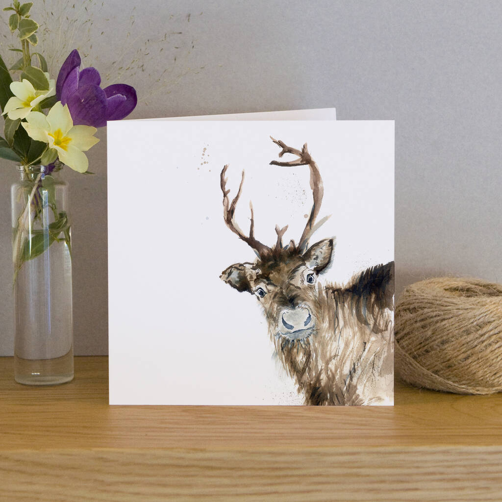 A luxurious blank greeting card featuring my hand-drawn festive Reindeer, printed on textured watercolour card in eco-friendly ways, which can be sent direct.