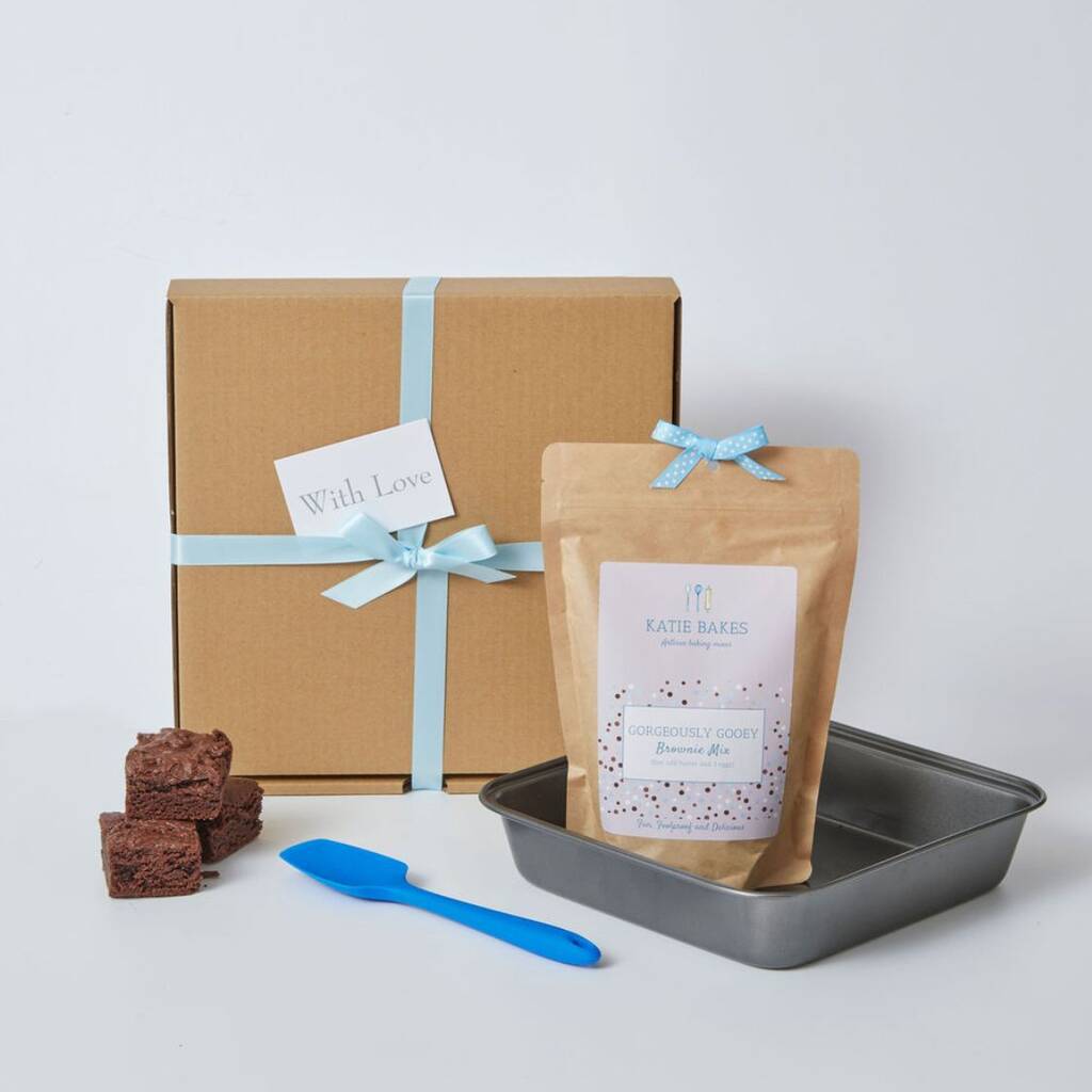 A Brownie Baking kit including a foolproof and delicious Award winning Gorgeously Gooey' Chocolate Brownie Mix, a non stick baking tin and silicone spatula spoon.