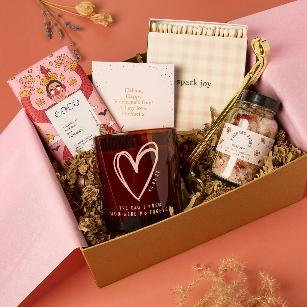 This luxury gift set pairs artisan treats with a bespoke keepsake candle, making it a thoughtful way to celebrate your loved one on Valentine's Day.