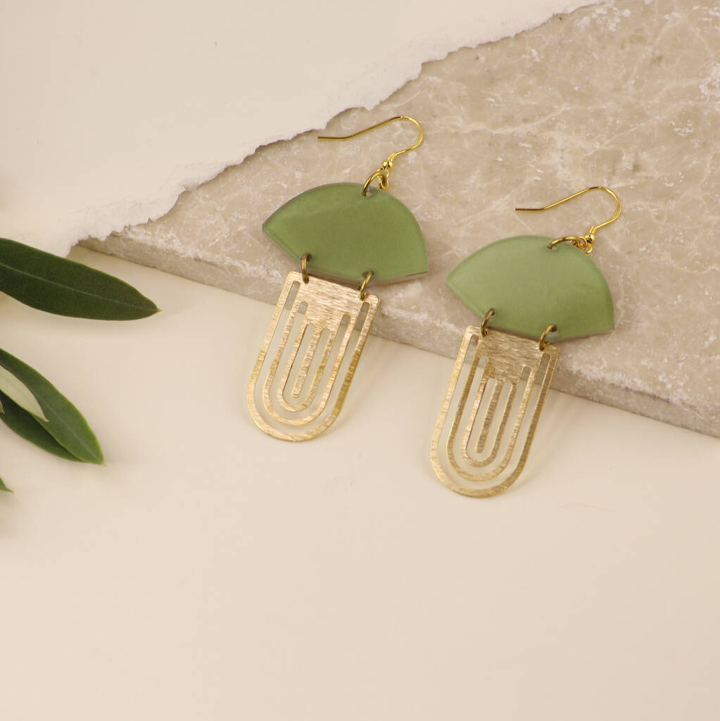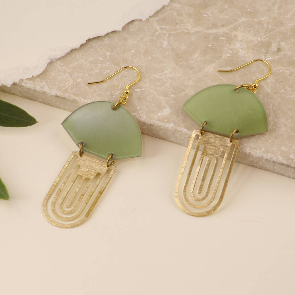 Jade Brass Art Deco Acrylic Gold Plated Fan Drop Earrings