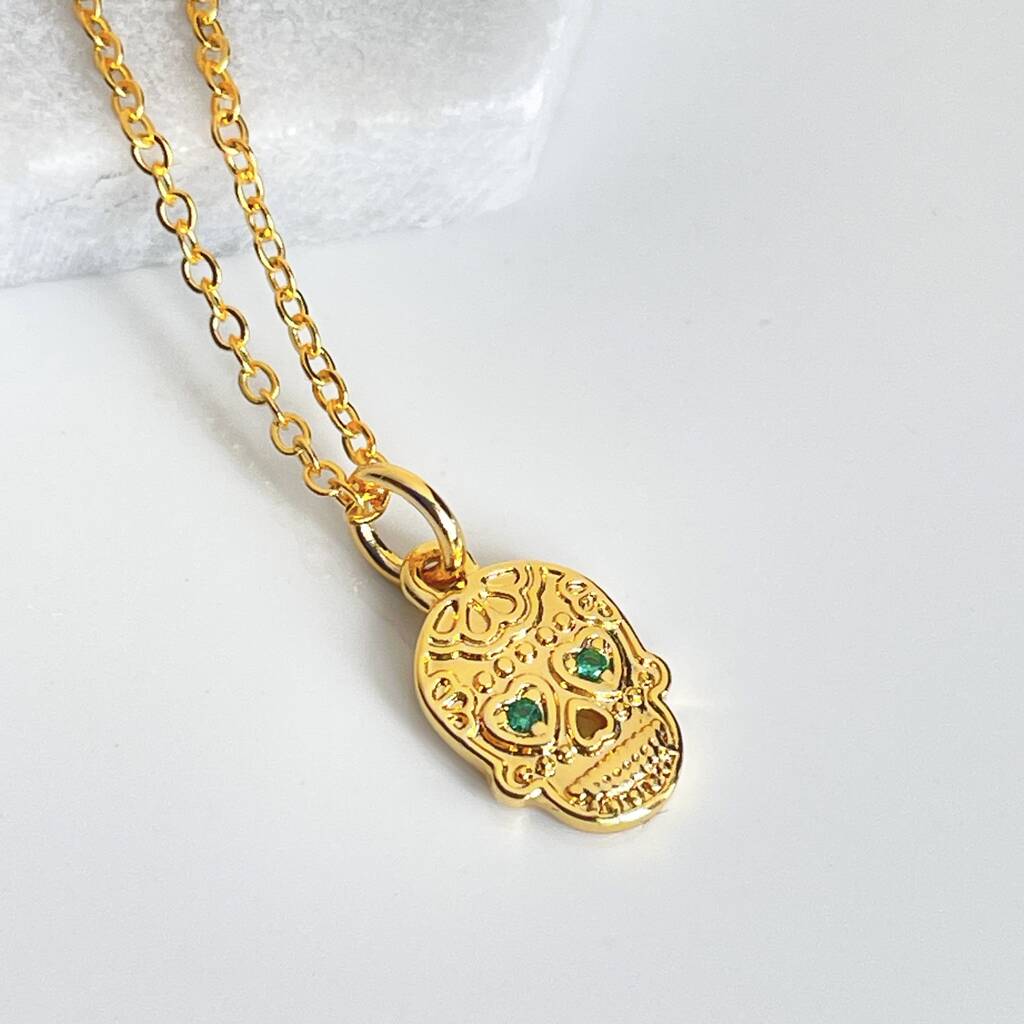 Skull Necklace With Emerald Crystals In Gold Plate