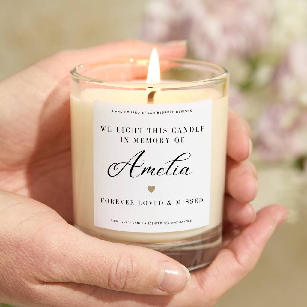 A beautiful bespoke memorial gift candle to personalise in loving memory of a passed loved one. Our candles are carefully hand poured and make special keepsakes to show that those who are no longer with us will forever be in our hearts.