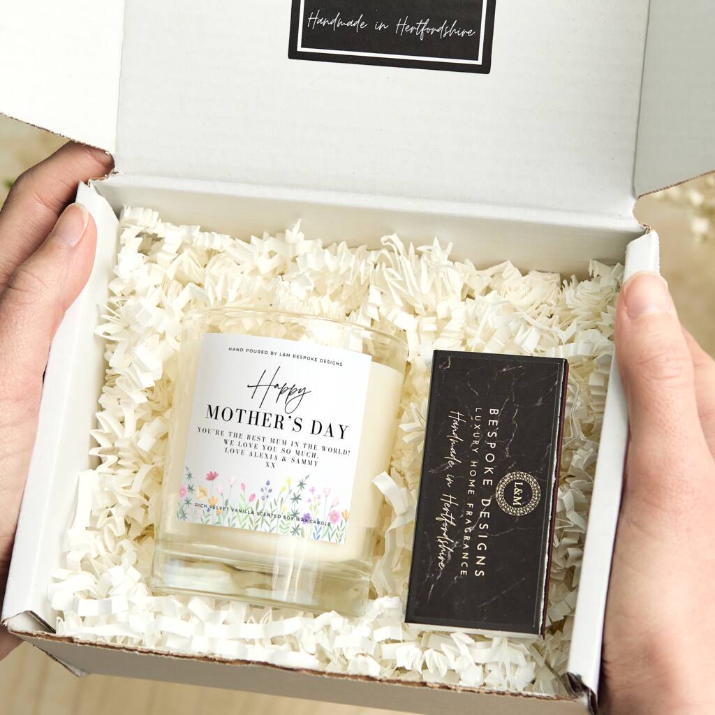 Make Mother’s Day extra special with this beautiful scented candle. Featuring the heartfelt message 'Happy Mother’s Day', it can be personalised with your own custom message. Made with natural soy wax and luxury fragrance, it’s the perfect gift to show Mum just how much she means to you.
