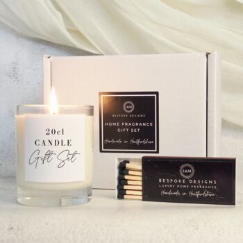 • 20cl Clear Candle Gift Set: This includes the 20cl clear candle and branded matches wrapped in our white recyclable box. Includes white shredded paper.