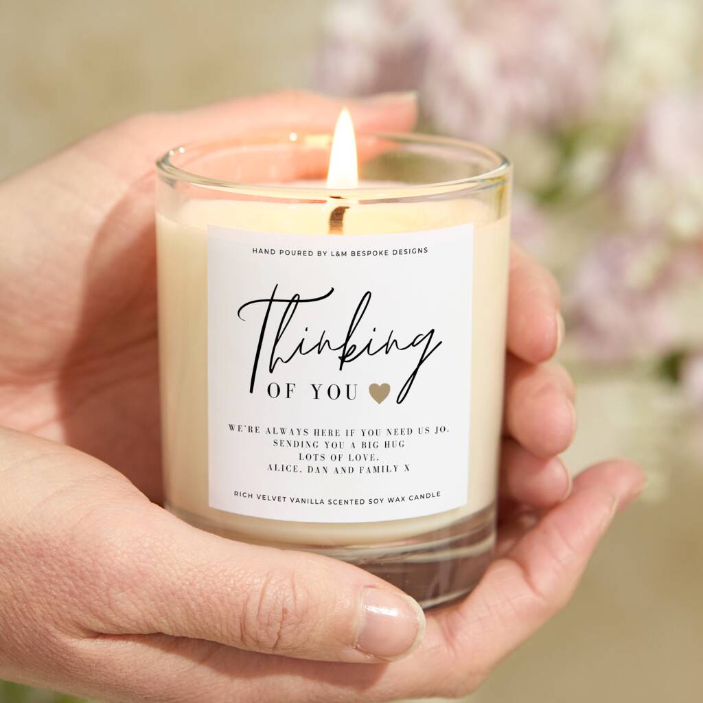 This personalised candle is a thoughtful way to let someone know you’re thinking of them during a challenging time. Hand-poured using natural soy wax, it creates a calm, comforting atmosphere and features a gentle message alongside your chosen personalised text. Designed to offer warmth and reassurance, it’s a meaningful gift for moments when presence matters more than words. Simple, comforting, and made with care, this candle is a quiet reminder of support, kindness, and connection.