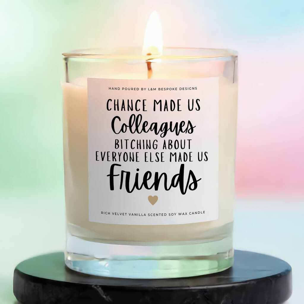 A funny candle celebrating work friendships, perfect for a colleague who became a best friend through shared laughs and daily office chaos!