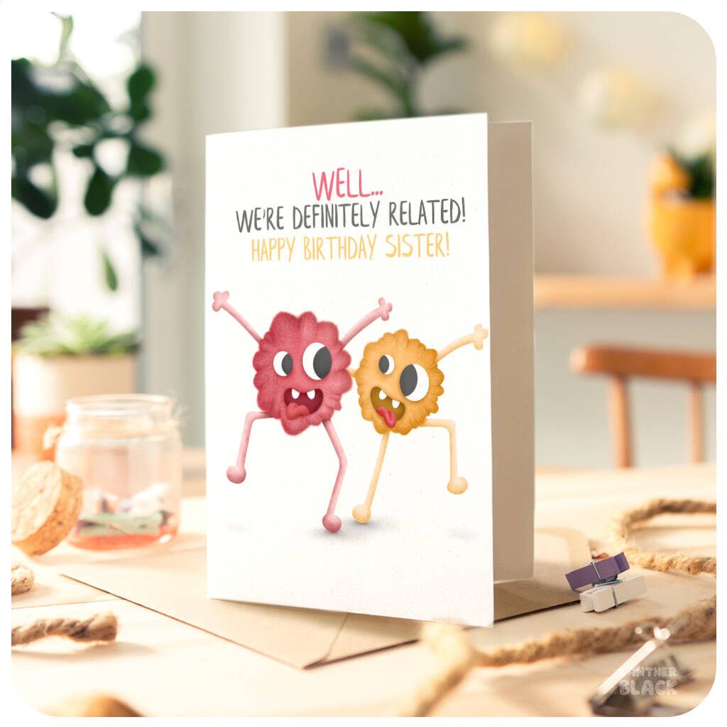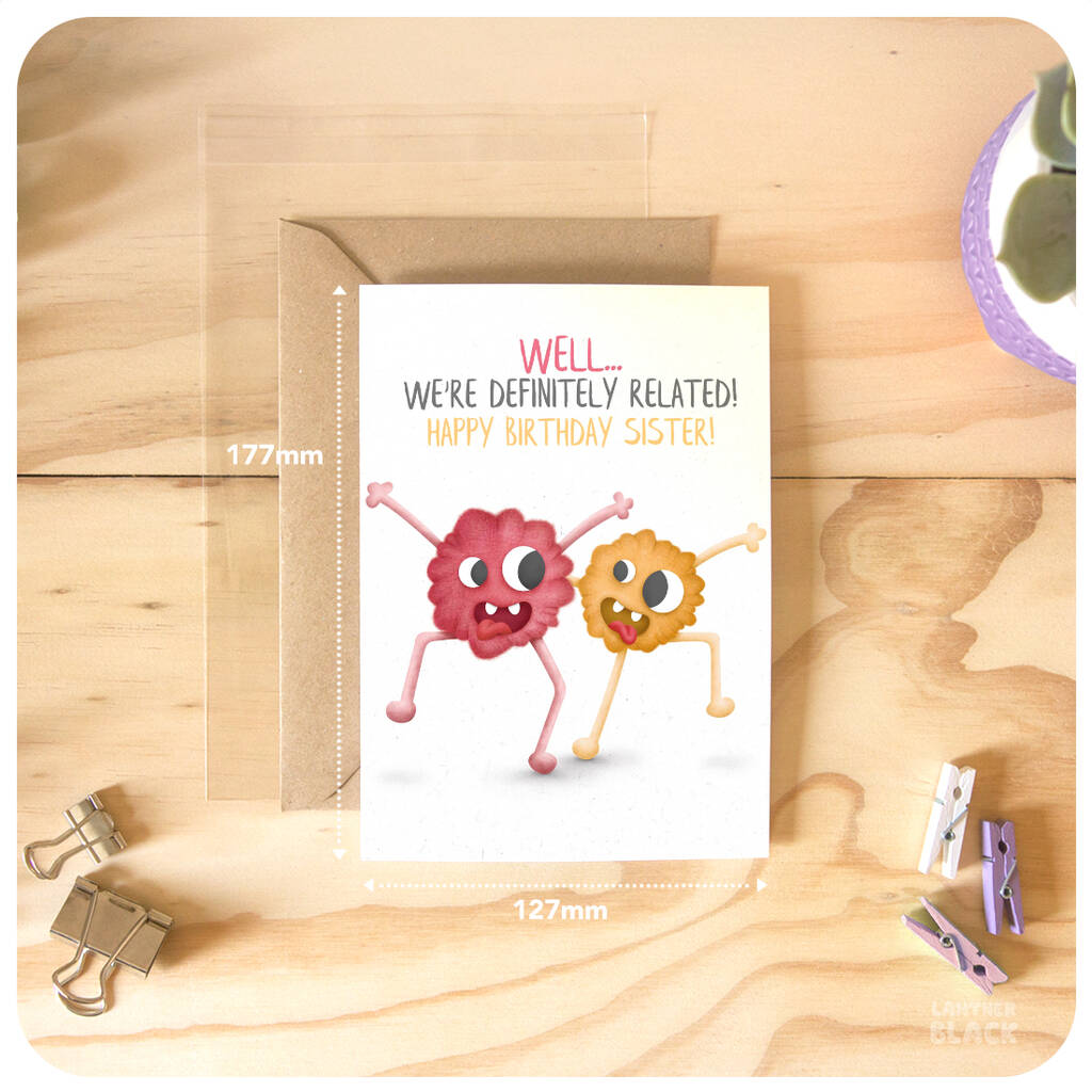 Funny Happy Birthday Sister Card, Cute Crazy Definitely Related Monsters From Brother Sis