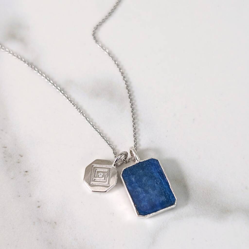 A beautiful sterling silver electroplated Lapis Lazuli rectangular slice pendant necklace teamed with a Citrine tumblestone or charm of your choice.