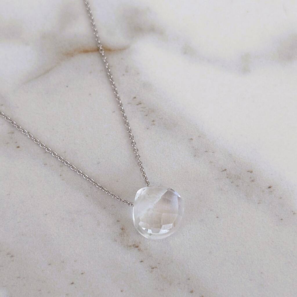 Clear Quartz Teardrop April Birthstone Necklace Silver