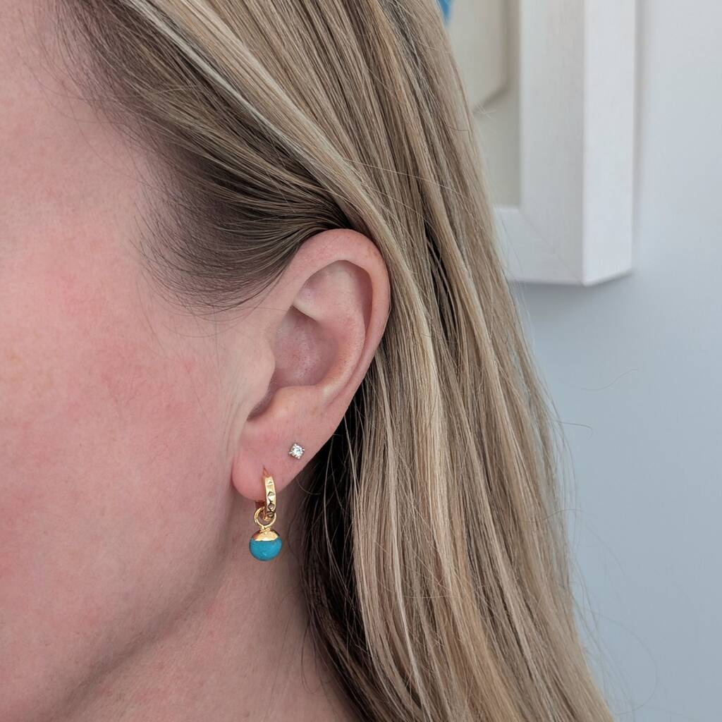Radiating elegance and beauty, these stunning earrings comprise circular Turquoise gemstone charms electroplated with 18 carat gold and suspended on delicate hoop earrings.