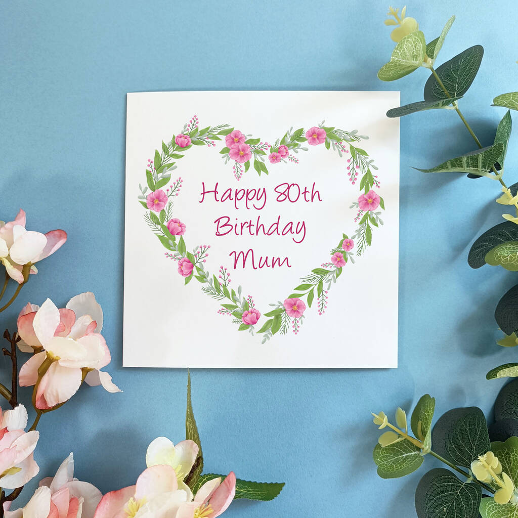 Personalised 80th Birthday Card. Floral Pink Heart Birthday Card For Her