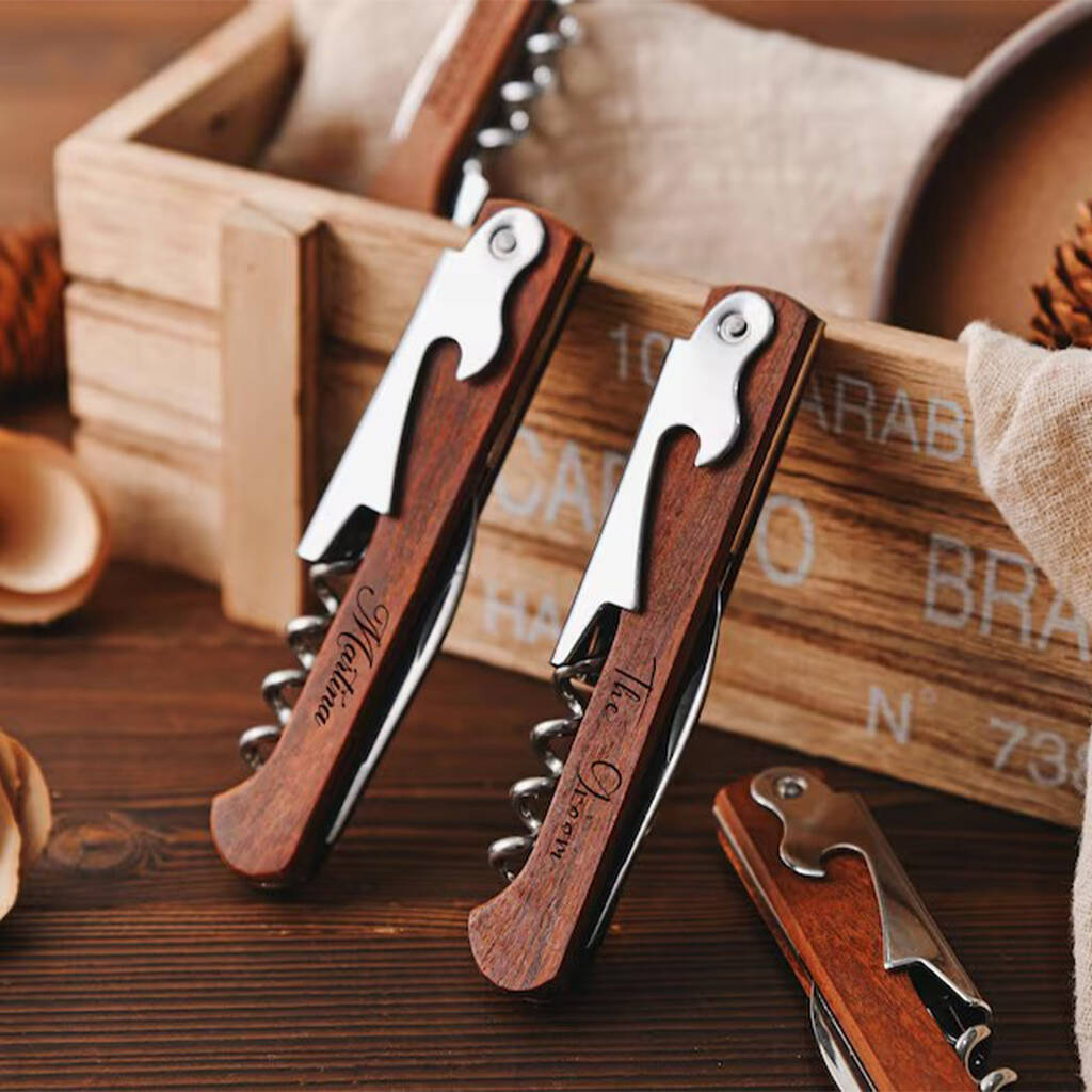 Personalized wine opener with engraved corkscrew, elegant gift bag, and set box. Perfect custom gift for dad, wine lovers, Father’s Day, birthday, or anniversary.This custom 3-in-1 wine opener combines a corkscrew, bottle opener, and foil cutter in one stylish design. Crafted from durable stainless steel with a natural rosewood handle, it offers both strength and elegance. Compact, foldable, and easy to use, it’s a must-have for wine lovers and professionals alike. Personalization makes it a thoughtful gift for dad, husband, friends, or colleagues on birthdays, weddings, Father’s Day, anniversaries, or Christmas.This is a bladed item. By purchasing this product you confirm that you are 18 years old or over