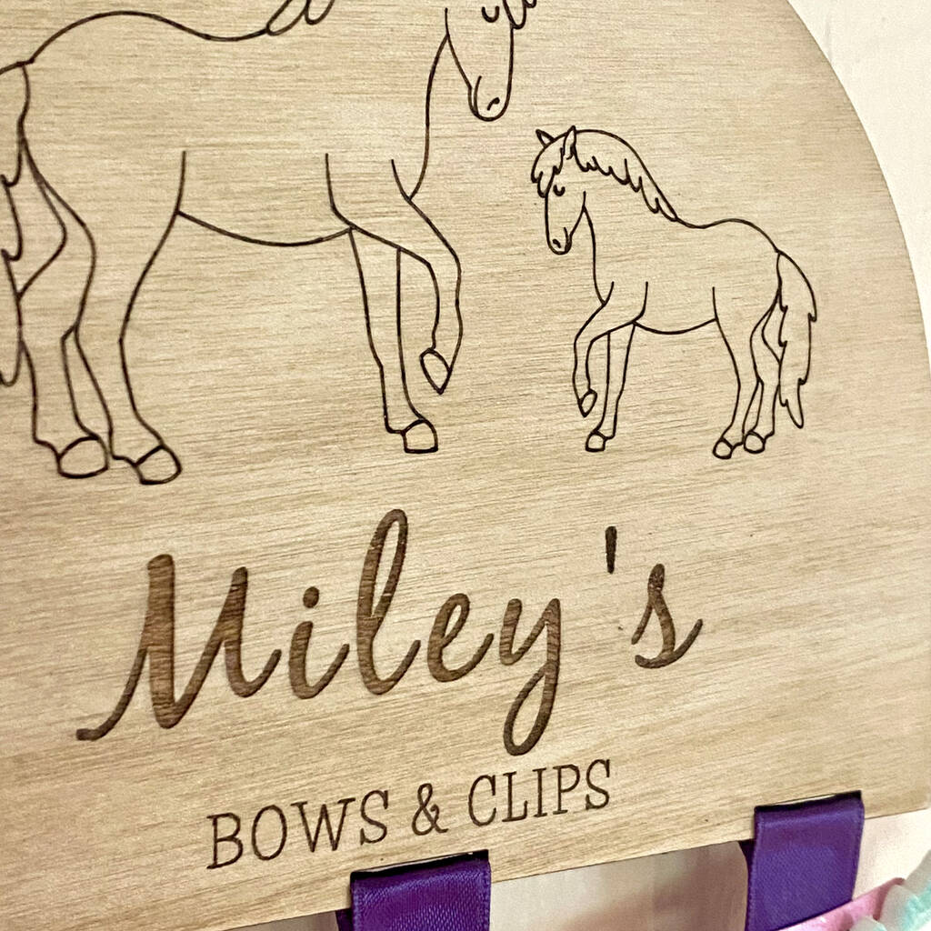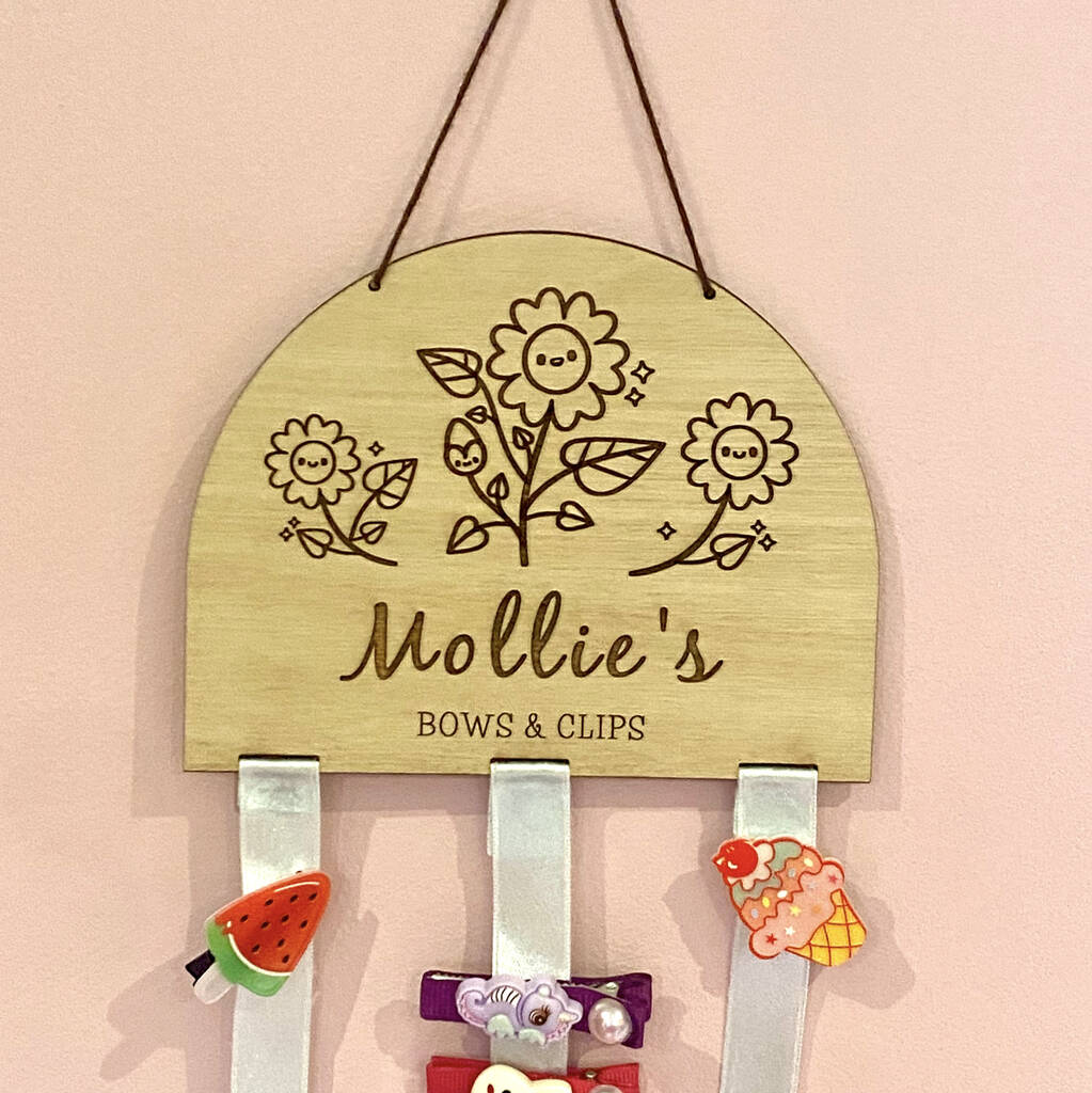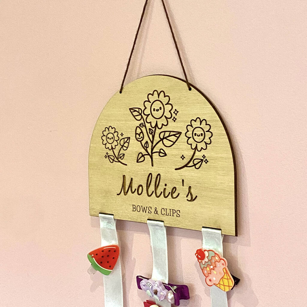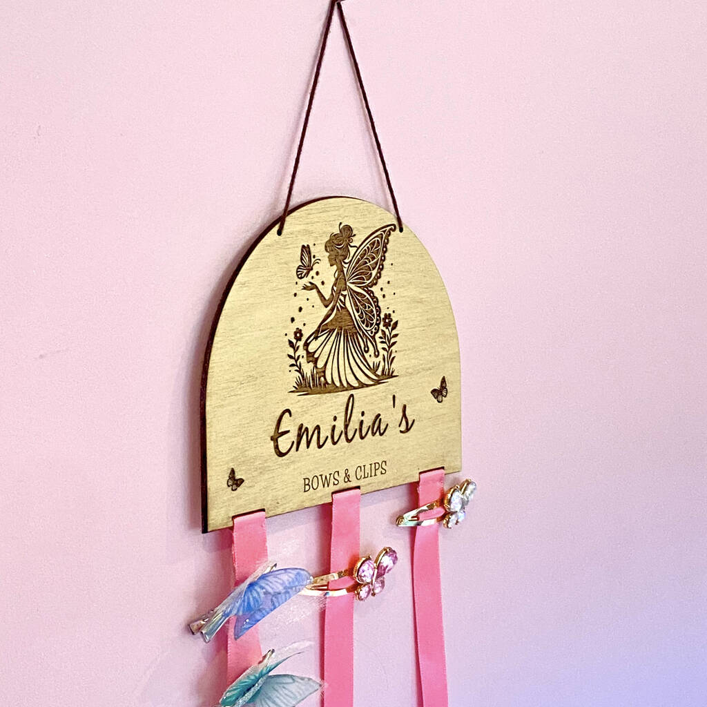 Keep your little one’s bows and clips beautifully organised with this adorable personalised hair accessory hanger. Perfect for bedrooms, nurseries, or as a thoughtful gift.Keep bows and clips beautifully organised with this personalised hair accessory holder, custom engraved with your child’s name and a sweet design. Perfect for nurseries, bedrooms, or as a thoughtful baby shower or birthday gift. Handmade with care, it’s both practical and charming wall decor.