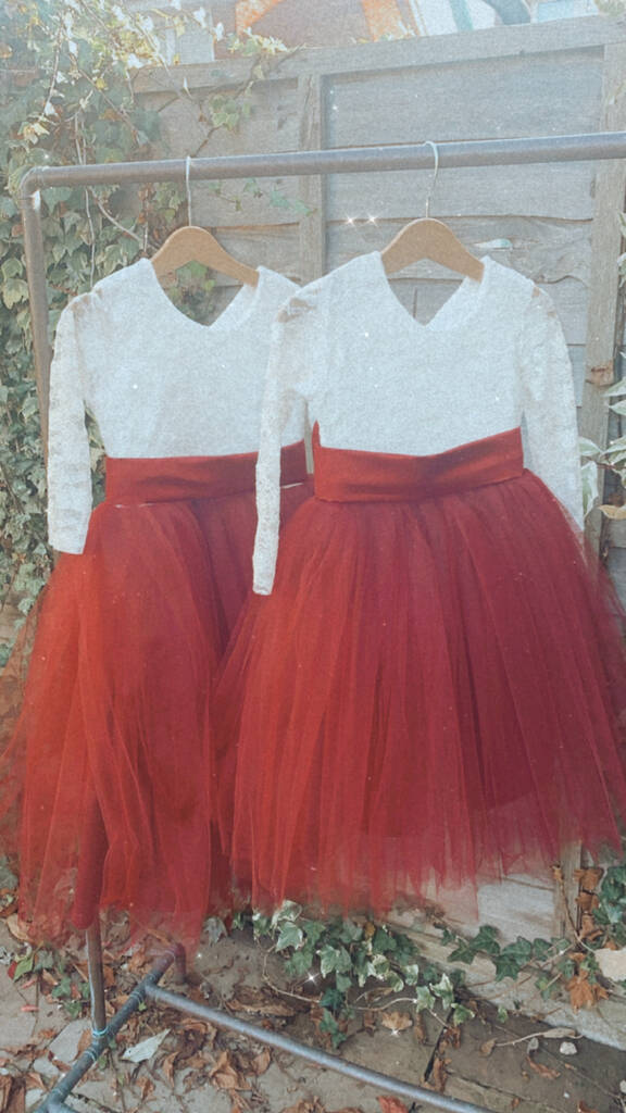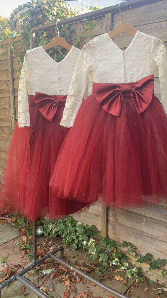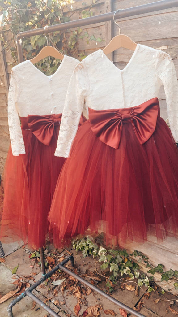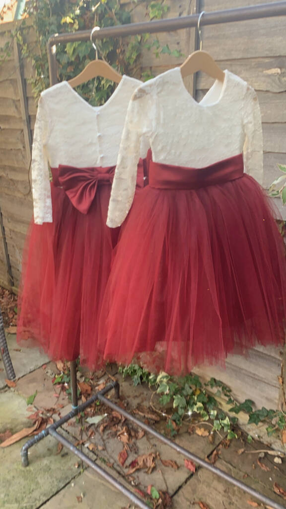 Elegance meets timeless charm in our beautiful long sleeve lace flower girl dress, perfect for weddings, Holy Communions, Christenings, and other special occasions. Handmade in the UK, this ankle-length gown features intricate lace detailing, a soft layered tulle skirt, and a stunning heart-shaped back for a graceful and memorable finish.