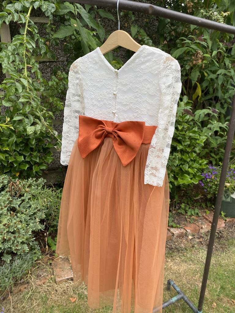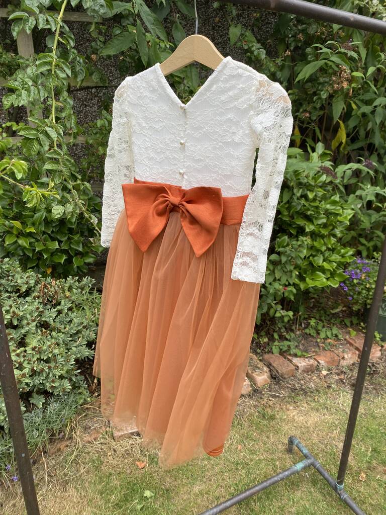Elegance meets timeless charm in our beautiful long sleeve lace flower girl dress, perfect for weddings, Holy Communions, Christenings, and other special occasions. Handmade in the UK, this ankle-length gown features intricate lace detailing, a soft layered tulle skirt, and a stunning heart-shaped back for a graceful and memorable finish.