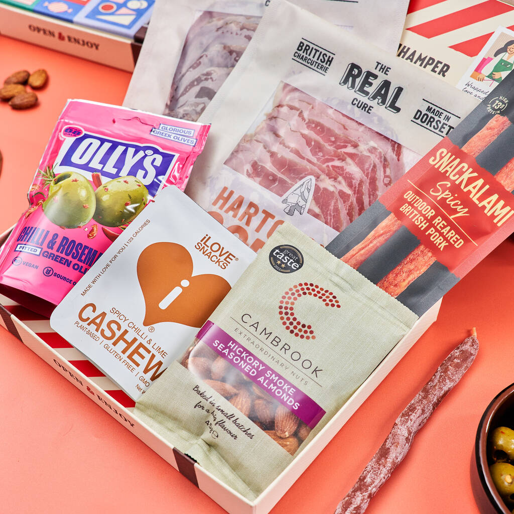 This special edition hamper includes the very finest cured meats sourced from across the UK, including Deli Farm Charcuterie's award winning Cornish Fiocci smoked ham, Serious Pig Snacking Salami and Real Cure Aberdeen Angus beef bresaola. To complement the meats, Cambrook hickory smoked roasted almonds, Olly's Haldiki olives with red chilli and extra virgin olive oil and Chilli & Lime roasted cashews.