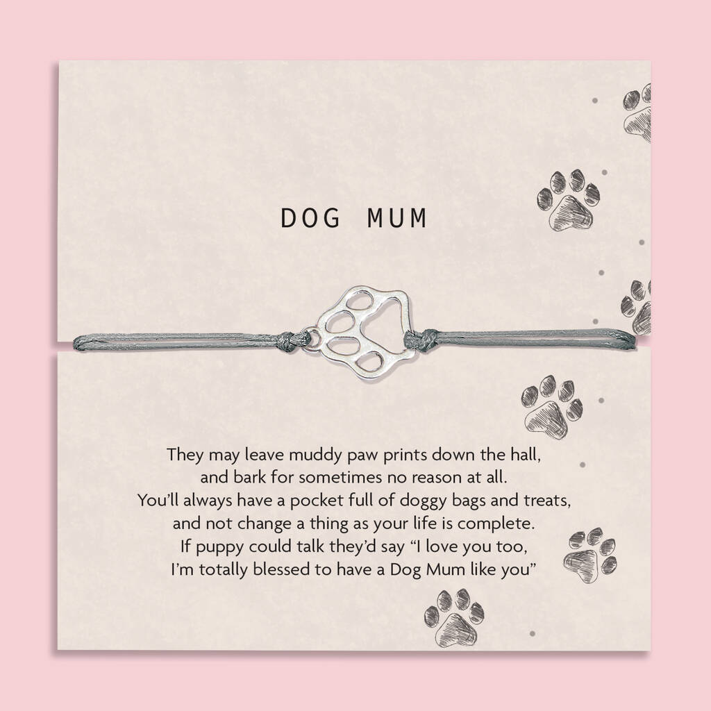 Celebrate the special bond between a dog and their favourite human with our Dog Mum bracelet, the perfect gift for any proud pet parent. Featuring a delicate silver paw print charm on a soft adjustable cord, this bracelet comes beautifully presented on a sentimental poem card decorated with paw prints. It’s a heartfelt keepsake that captures the love, loyalty and joy that dogs bring into our lives. Whether you’re searching for a birthday gift for a dog lover, a thank you present for a dog mum, or simply a thoughtful surprise for someone who adores their pup, this bracelet makes a meaningful and affordable jewellery gift.