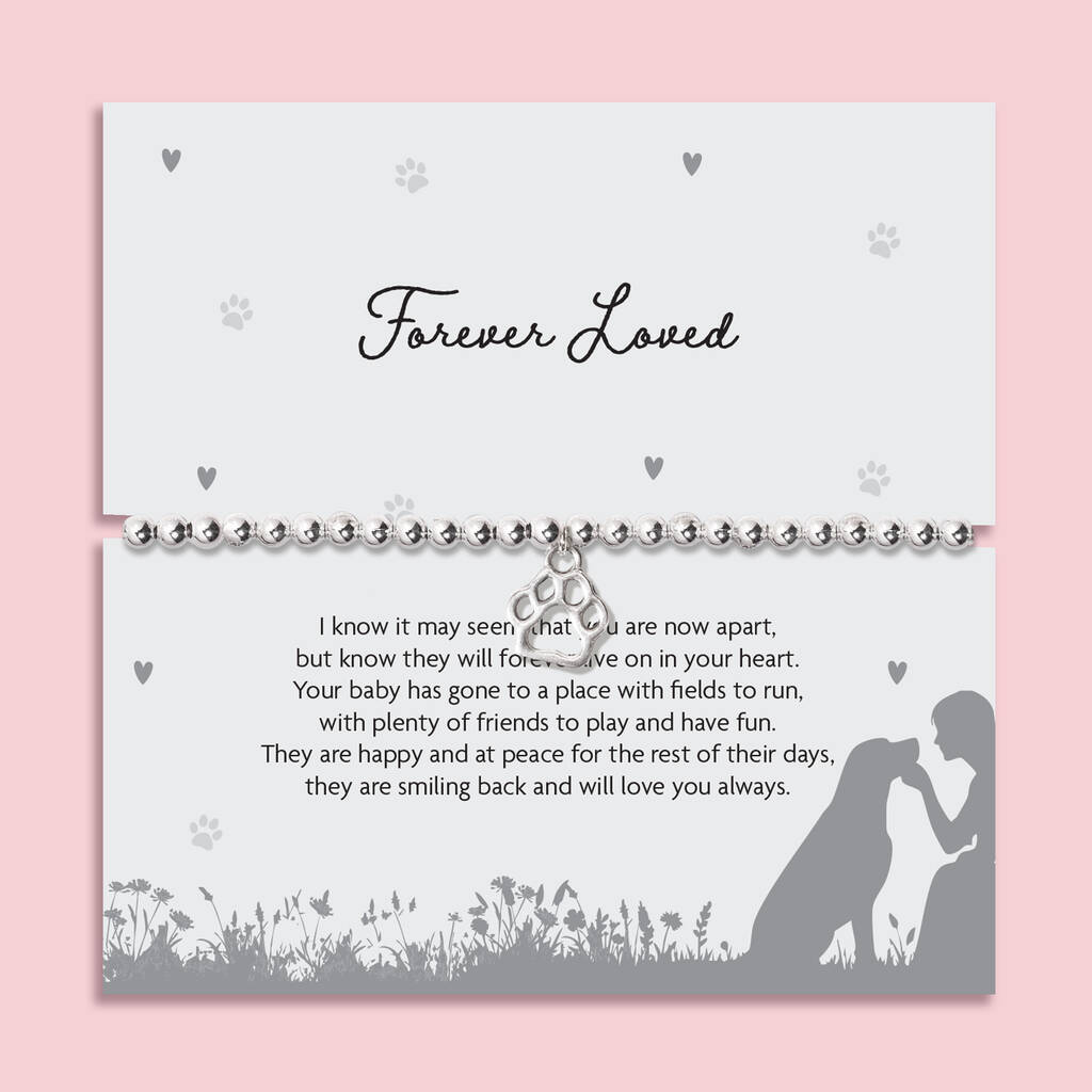 Our silver-plated beaded bracelet features a delicate paw print charm, symbolising the unconditional love and lasting bond shared with a beloved dog or cat. Beautifully presented on a softly illustrated “Forever Loved” poem card, this meaningful keepsake serves as a gentle reminder that although they may no longer walk beside us, they remain forever in our hearts.