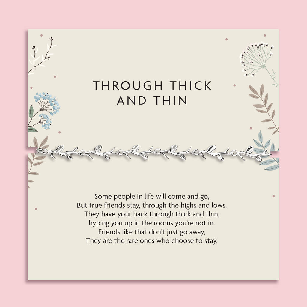Presented on our beautifully illustrated “Through Thick and Thin” poem card, this bracelet makes a meaningful gift for a best friend, sister, soul sister or someone who has always been there when it mattered most. Perfect for birthdays, bridesmaid proposals, thank you gifts, long distance friendships or simply as a reminder that true friends are the ones who choose to stay.